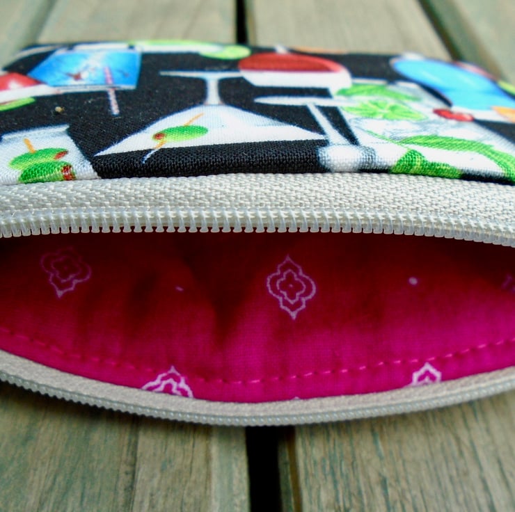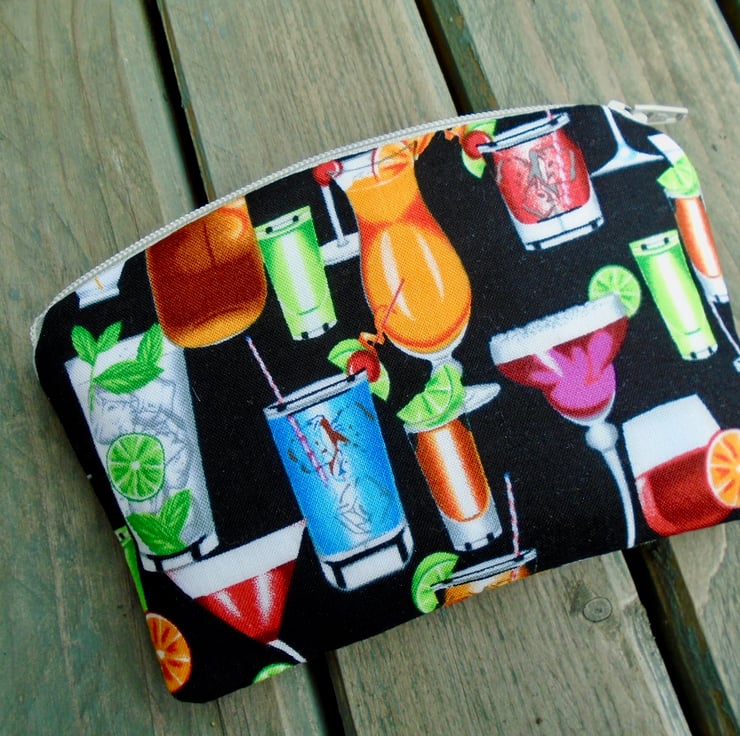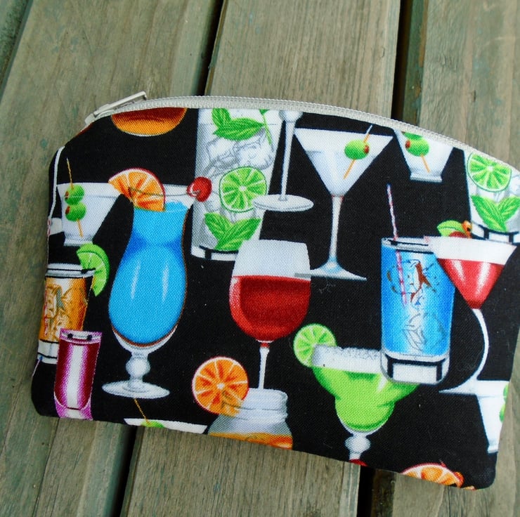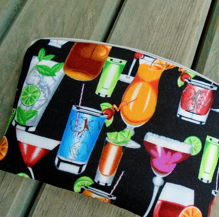 Made in a funky printed cotton fabric , featuring a selection of drinks .