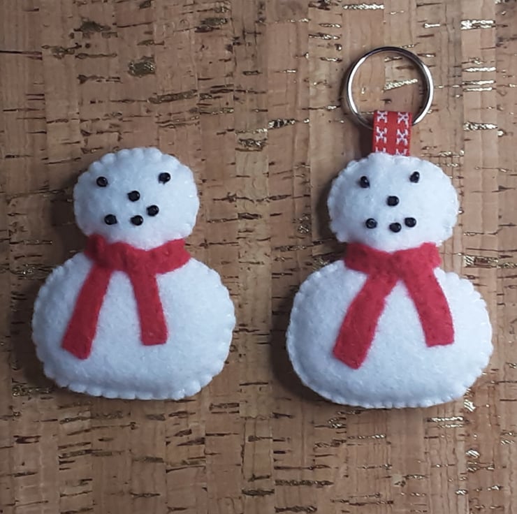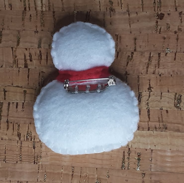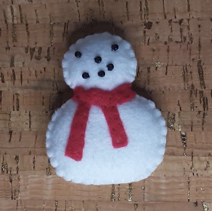 The main colour of the Snowman is white. The eyes and mouth are made from black seed beads. It has a red felt scarf.