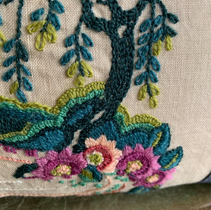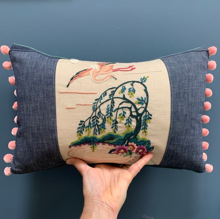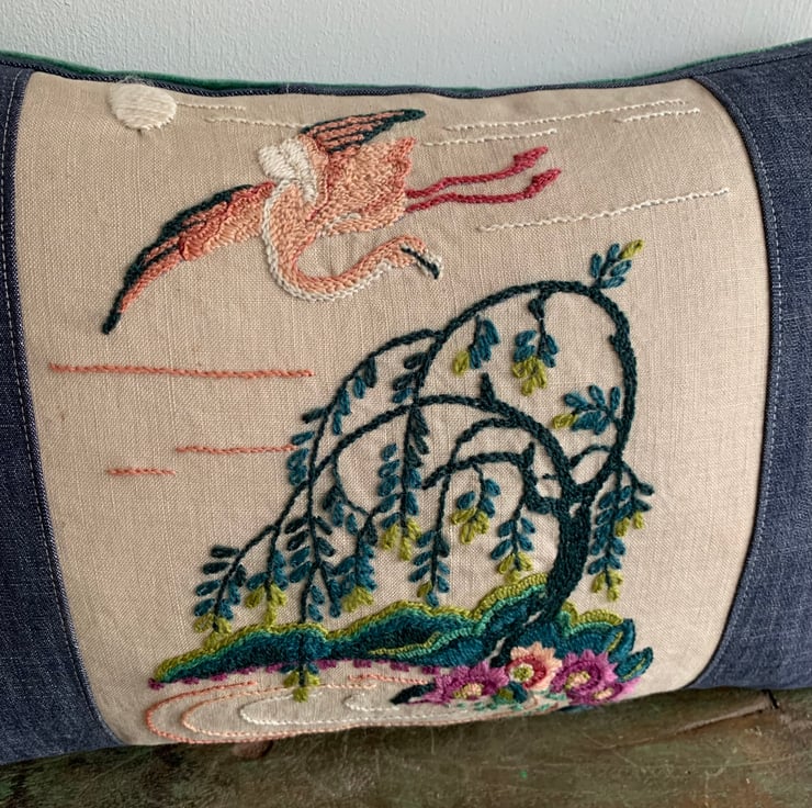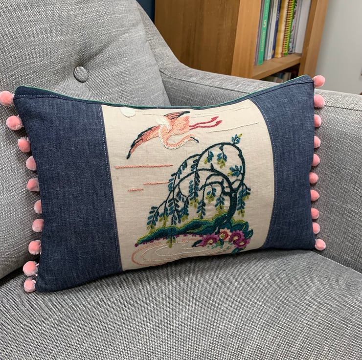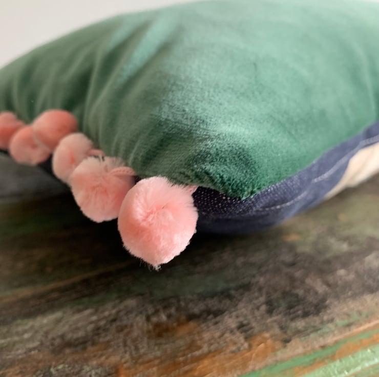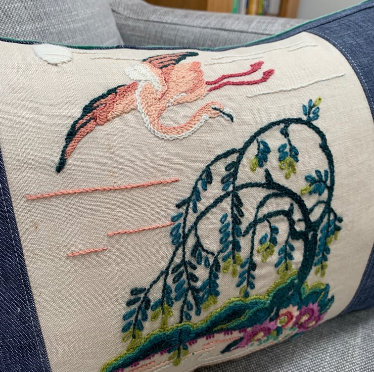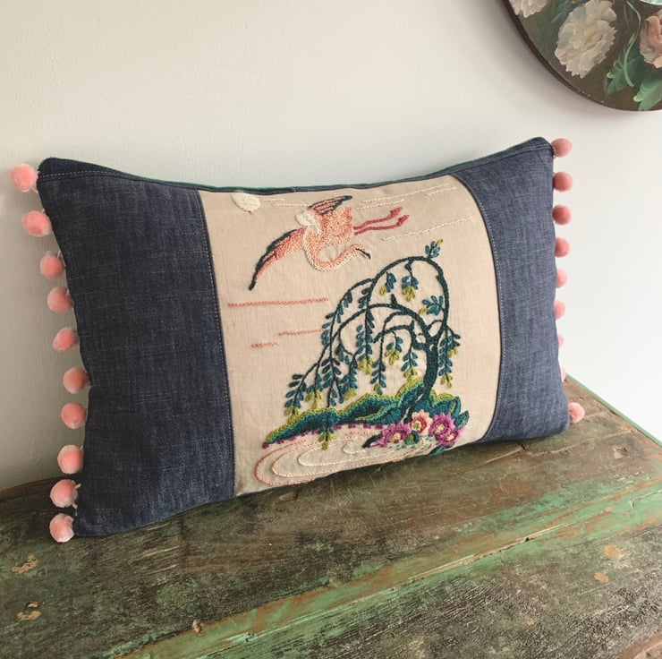 One of a kind cushion cover made from a vintage crewelwork flamingo embroidery and sample swatches of lightweight denim. The cover is backed with soft green velvet and the ends are trimmed with velvety pink pompoms.