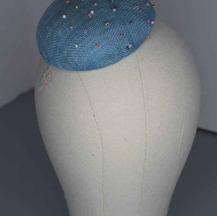 A sweet as can be mini beret hat. Handmade from sinamay straw, decorated with glass beads.