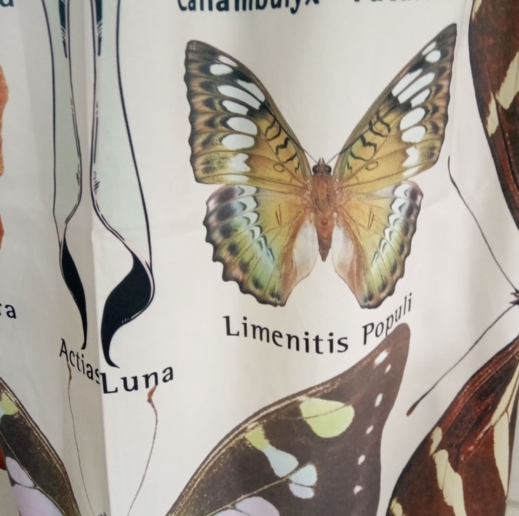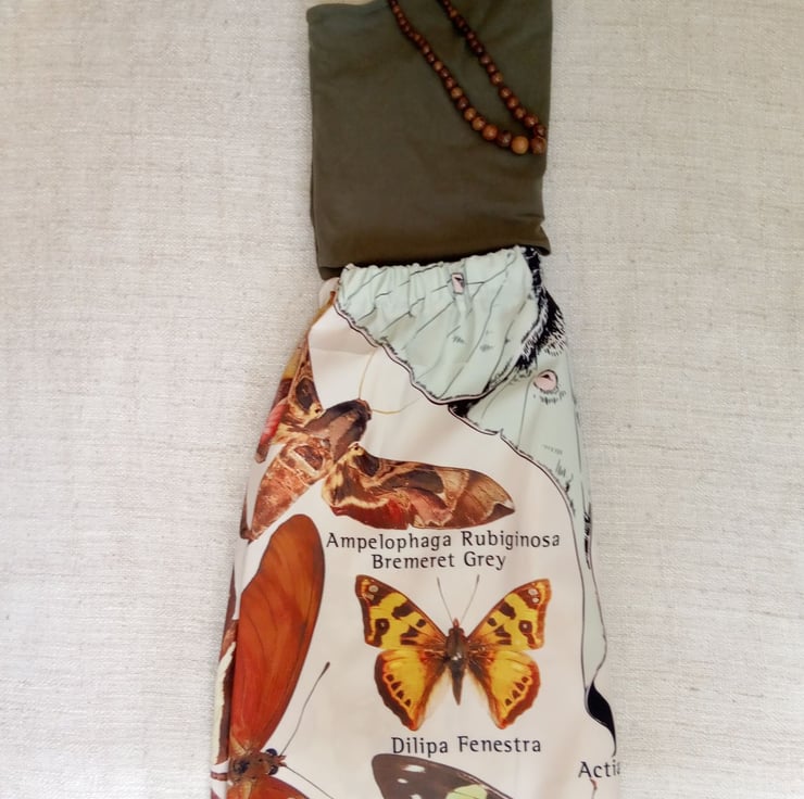 I love this butterfly chart wall hanging and thought I could upcycle it in to something beautiful and unique. Here it is, an elasticated skirt covered in butterflies, you can even learn their Latin names whilst wearing it.