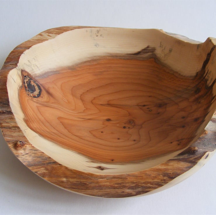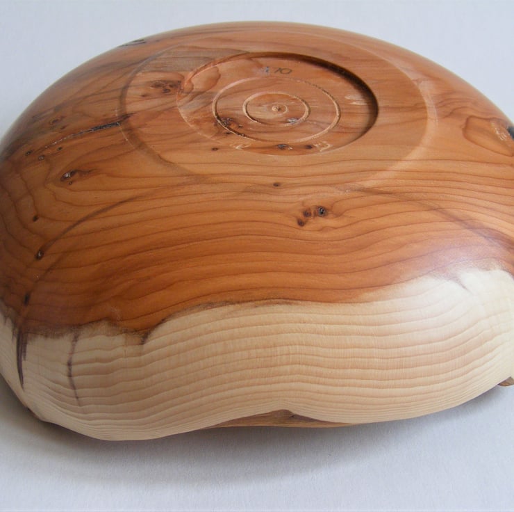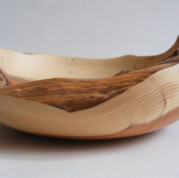 Natural edge Yew bowl, 195 x 74 mm, (19.5 x 7.4 cm) No.170. A striking natural edge Yew bowl, the nicely curving shape shows off the orange heart wood, which contrasts with the cream sap wood.