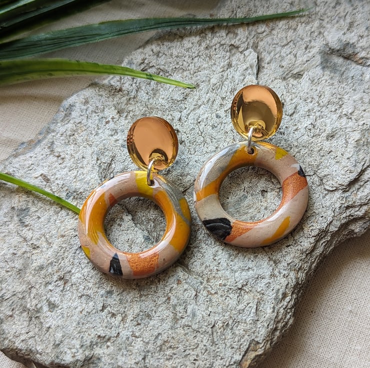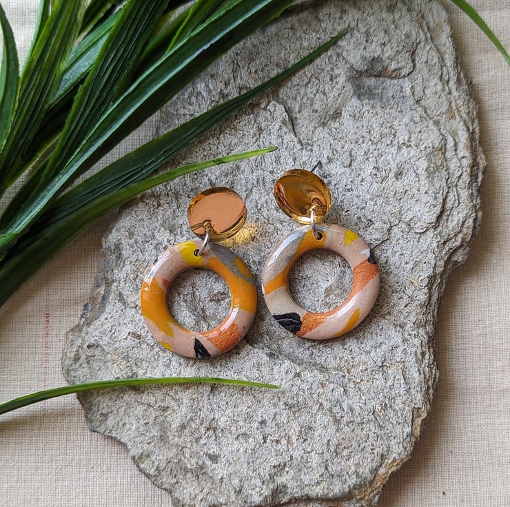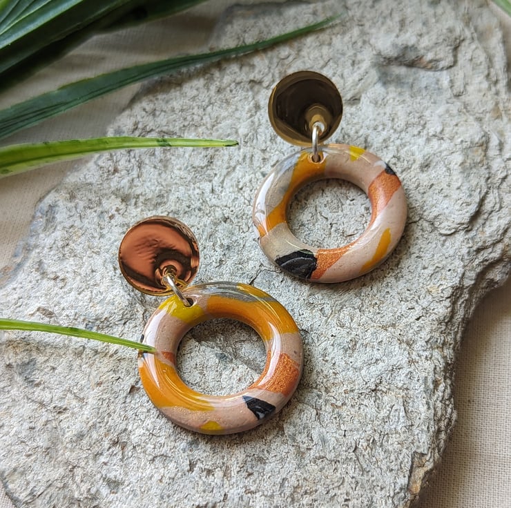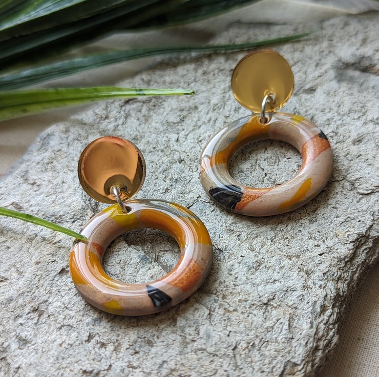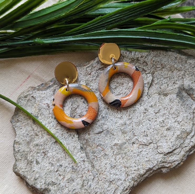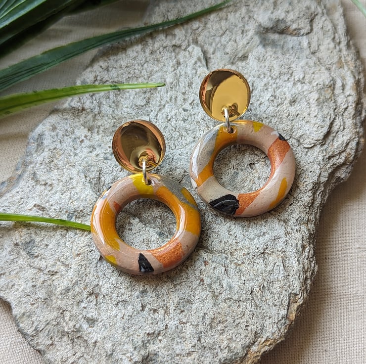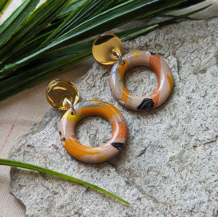 Attached to a circle doughnut shape of mixed array of warm colour tones of yellow, cognac, orange, taupe and black