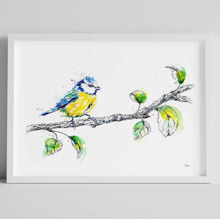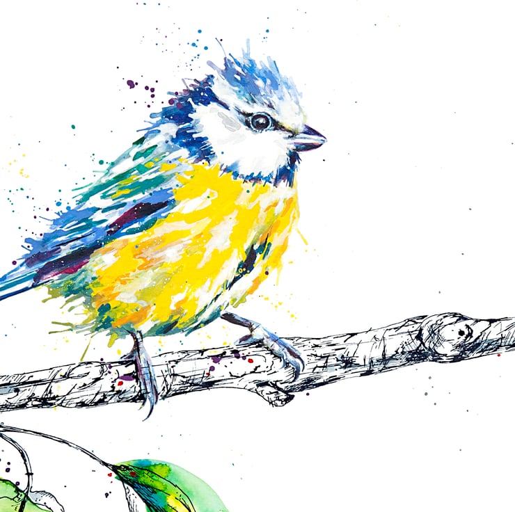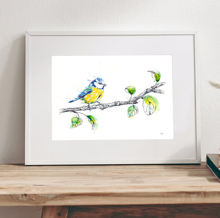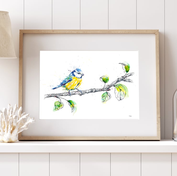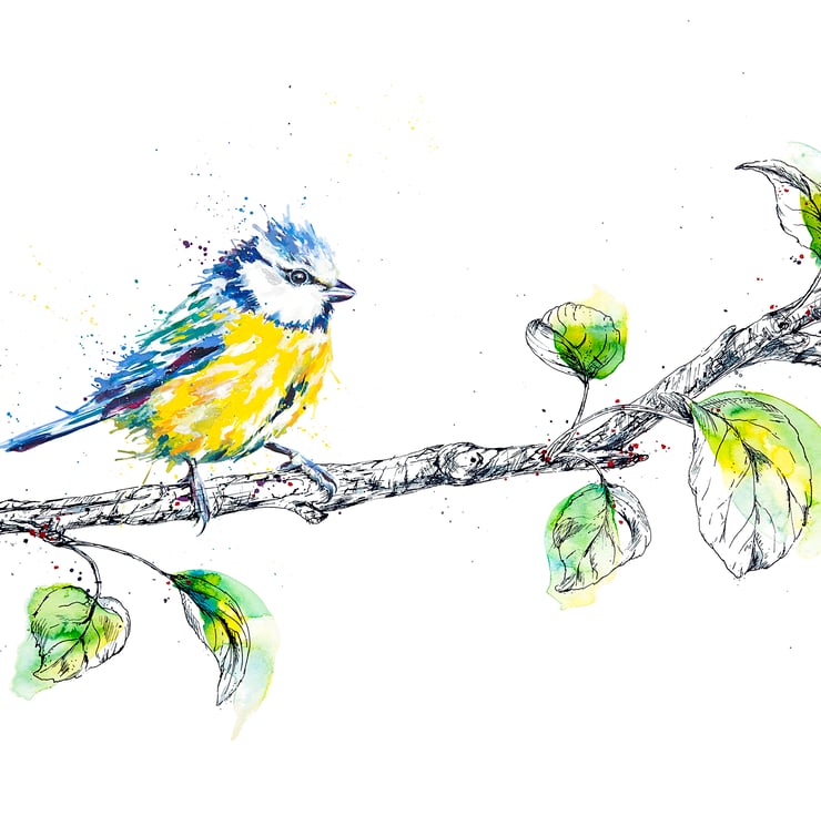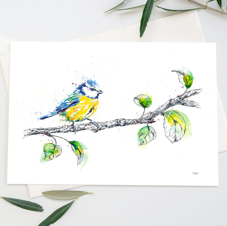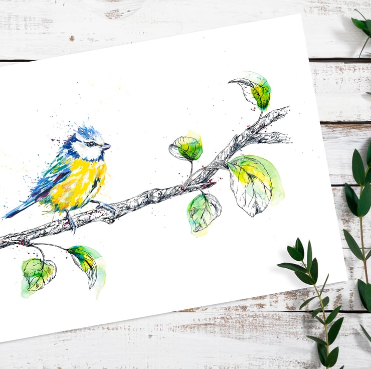My original painting depicts one of the UK's most colourful and cheeky garden visitors. The unmistakable blue and yellow of the blue tit is captured in watercolour. The branch is illustrated using a handcrafted glass dip pen.