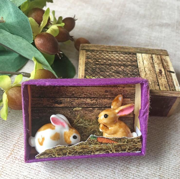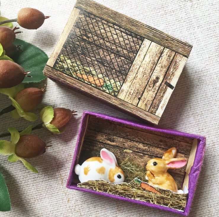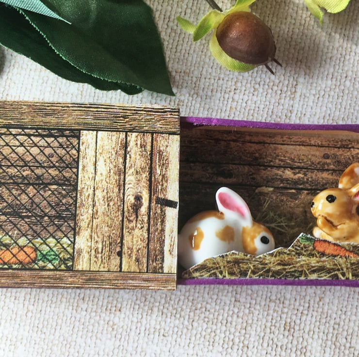 Matchbox art. Diorama -  Rabbits in hutch.