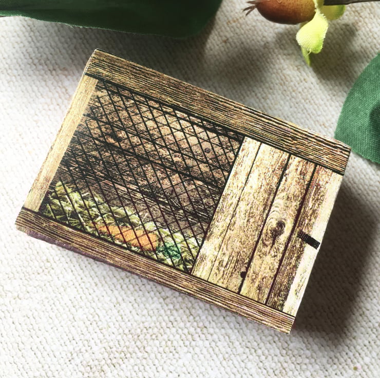 This diorama is housed inside a vintage matchbox. I've covered the top label and made the scene inside using colour paper copies backed with card. Apparently rabbits don't like to live on their own so I've added two tiny resin ones which I've painted with a very small brush!