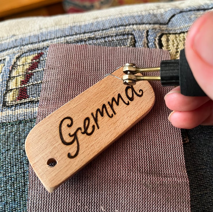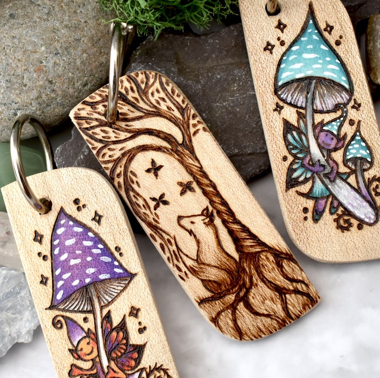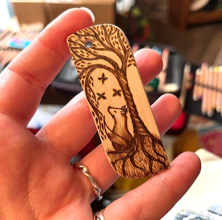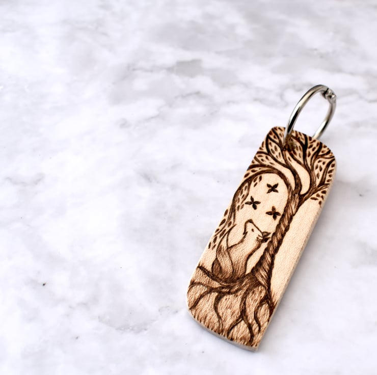 A cute wood burned keyring with a fox, watching a group of butterflies.