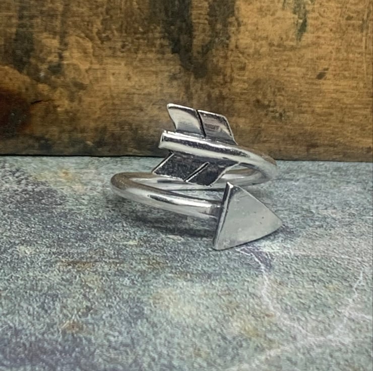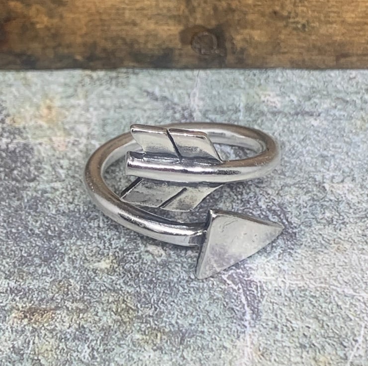 This Ring had been made using Sterling Silver and traditional methods. This unique ring wraps around your finger with a thick band of Silver with an arrow head and detail to create the feathers