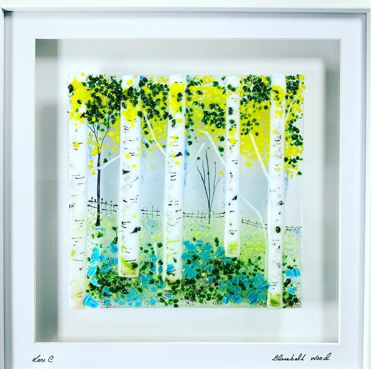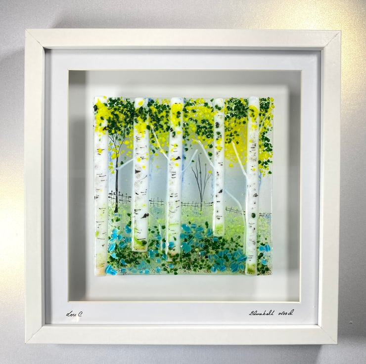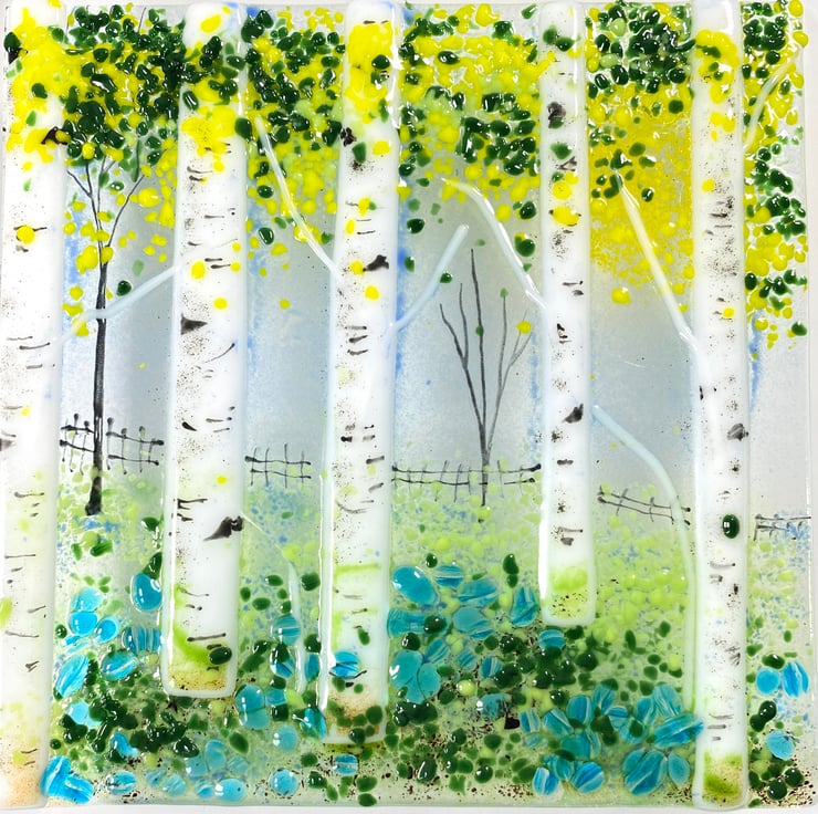 A lovely fused glass interpretation of silver birch trees . This frames glass art is 25 cm square and ready to hang - the square white frame is easy to hang anywhere in the home . Mounted to the front of the frame it allows the sunlight to get all around the tree scape . The glass art will look different throughout the day depending where it’s placed .