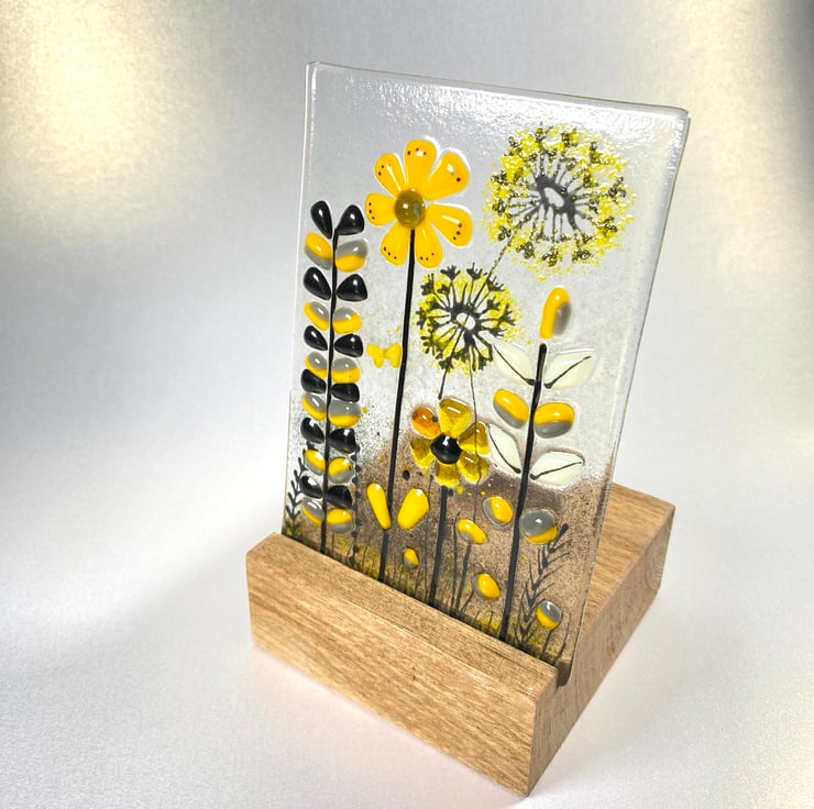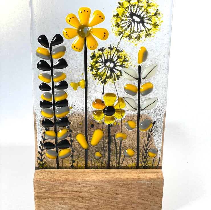 Fused glass 3 dimensional fused glass art in an oak base. A one of a kind piece of fused glass art that can be backlit with a candle for added interest in the evening . Fused glass retro inspired glass in yellow / grey and b black to perfectly complement the modern home .