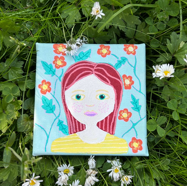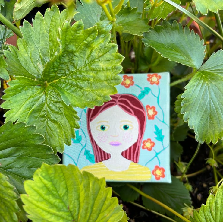 This sweet little canvas painting is 13 x 13 x 2 cm. No frame required. Artwork signed at the back.