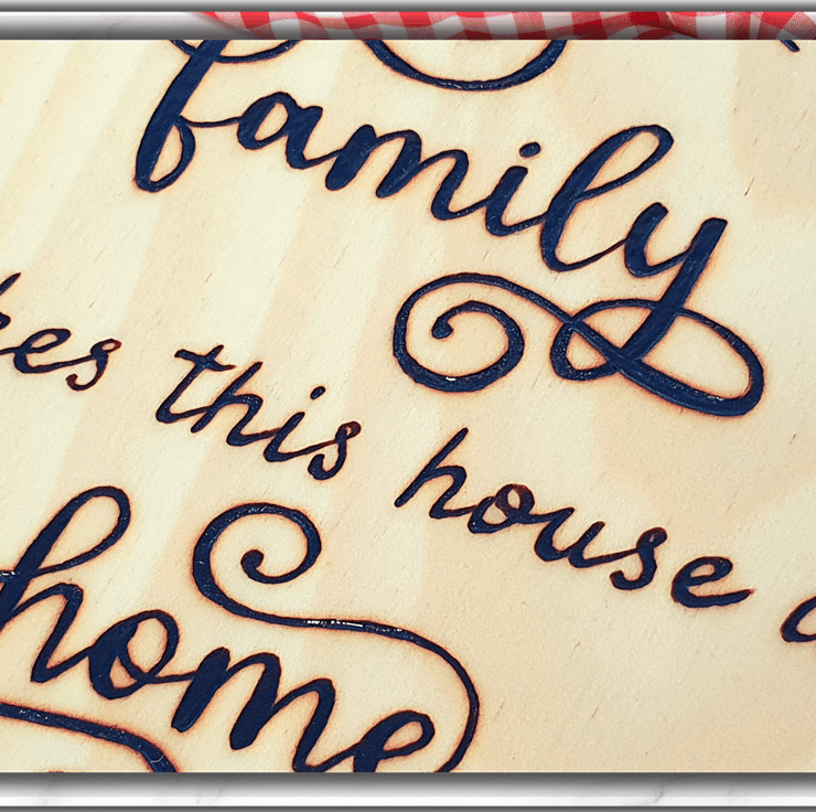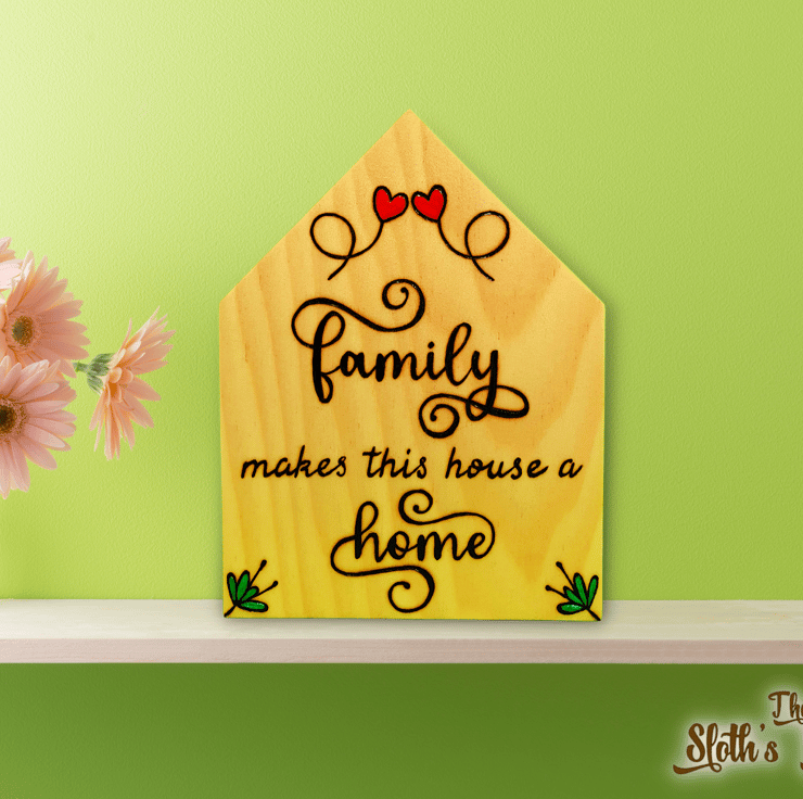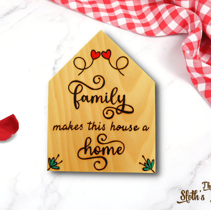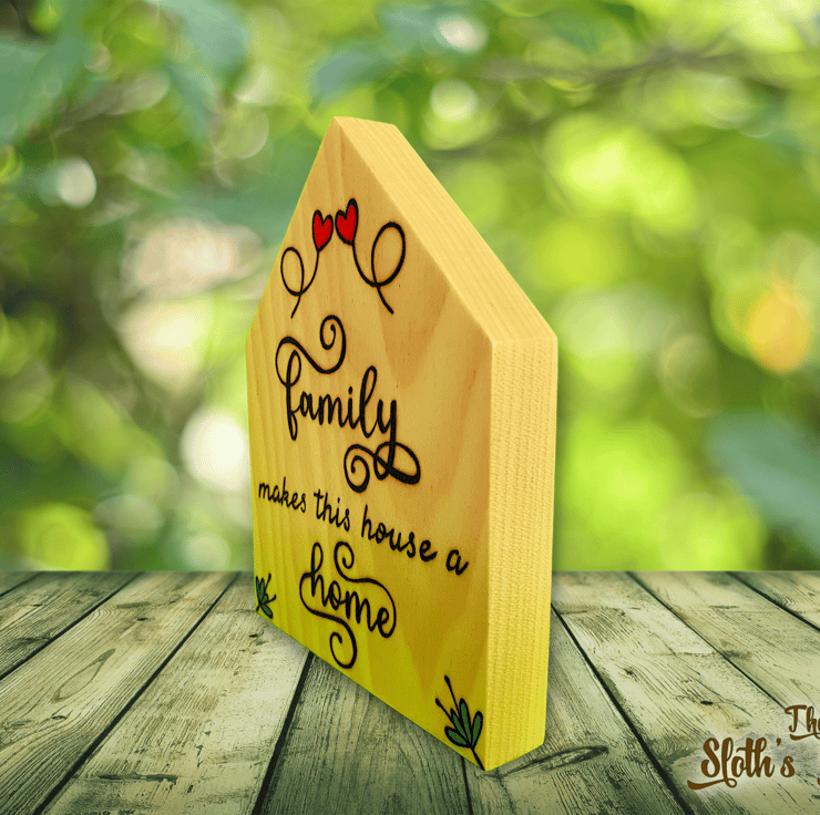 This free-standing ornament is made from tulipwood, cut in the shape of a house. The quote "Family Makes This House A Home" is hand drawn on the wood, with the method of pyrography (wood-burning). A decorative font has been used for the quote, with emphasis on the words "Family" and "Home".