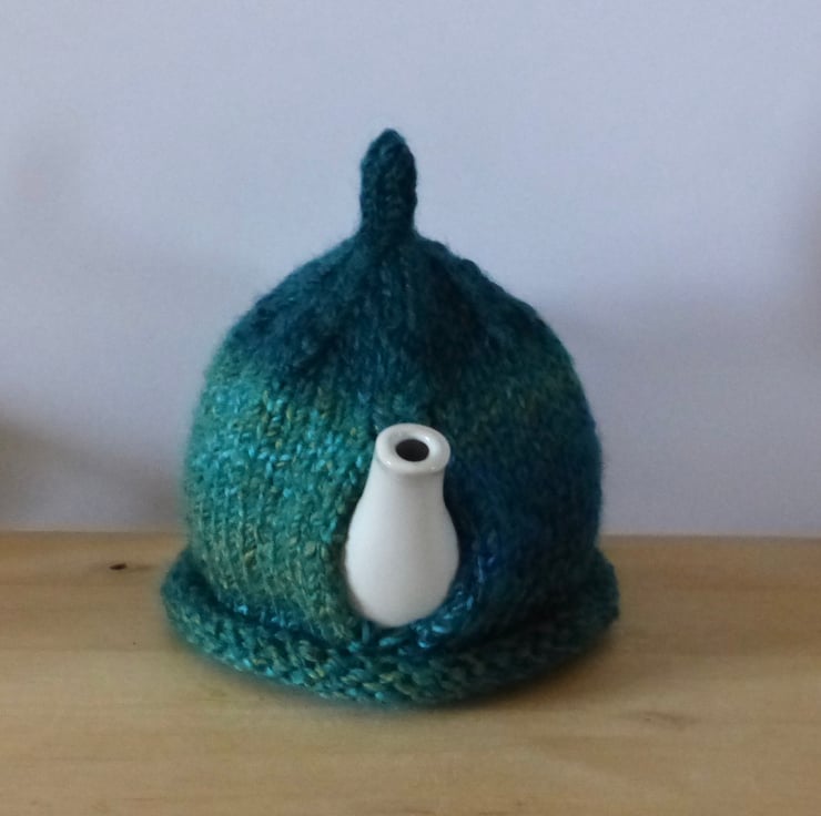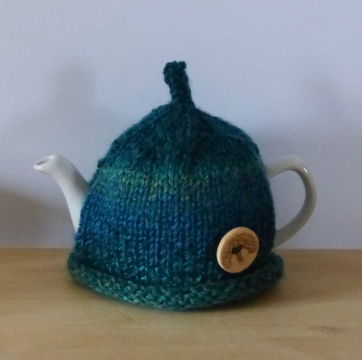 A hand knitted Tea Cosy in a bright variegated yarn in shades of Green and Blue. This cosy has a 'pixie' top and ta largel natural wood buttons with a tree design on the front for decoration.