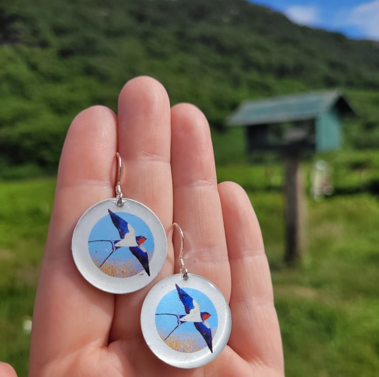 Aluminium and Sterling Silver earrings, approximately 25mm in diameter. The disc is made from aluminium and has had a print of an original artwork by Hannah MacIver transferred on to it, and then sealed in UV resin. Sterling silver ear hooks.
