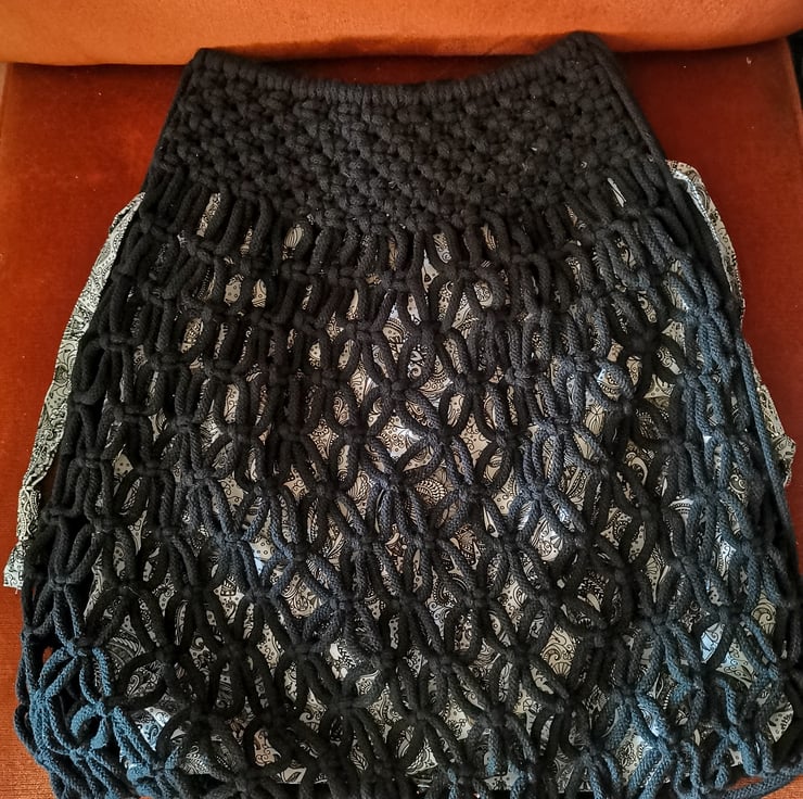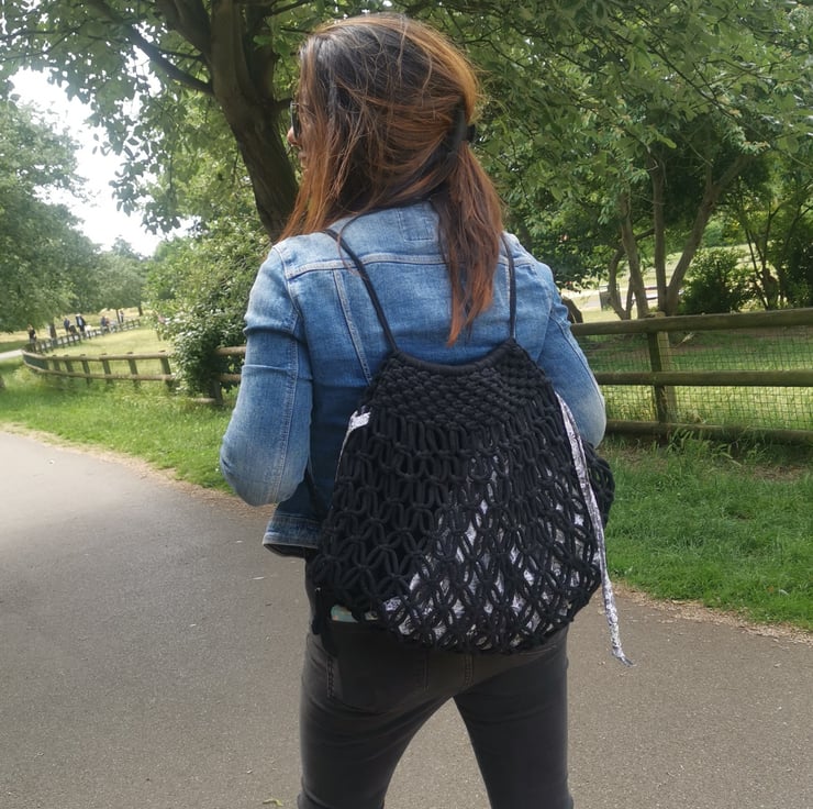Handmade macrame backpack in black colour made with 5mm braided cotton cord.