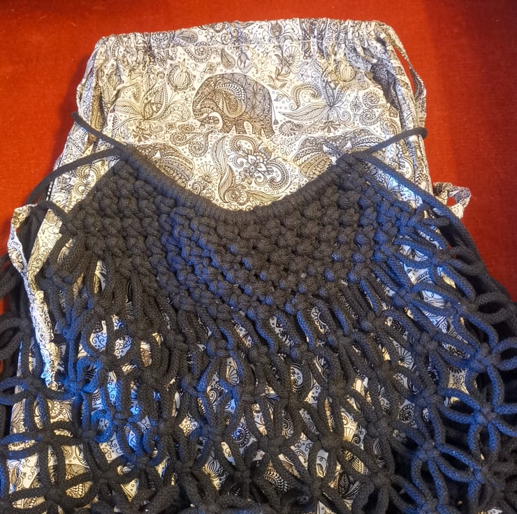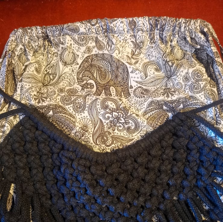 This bag is lined with drawstring bag in beautiful elephant boho pattern (handmade by fellow Folksy seller Aquila Crafts) which goes perfectly with this backpack as it attached to the back to secure it in place. Insert drawstring bag is also accented with alloy tube beads.