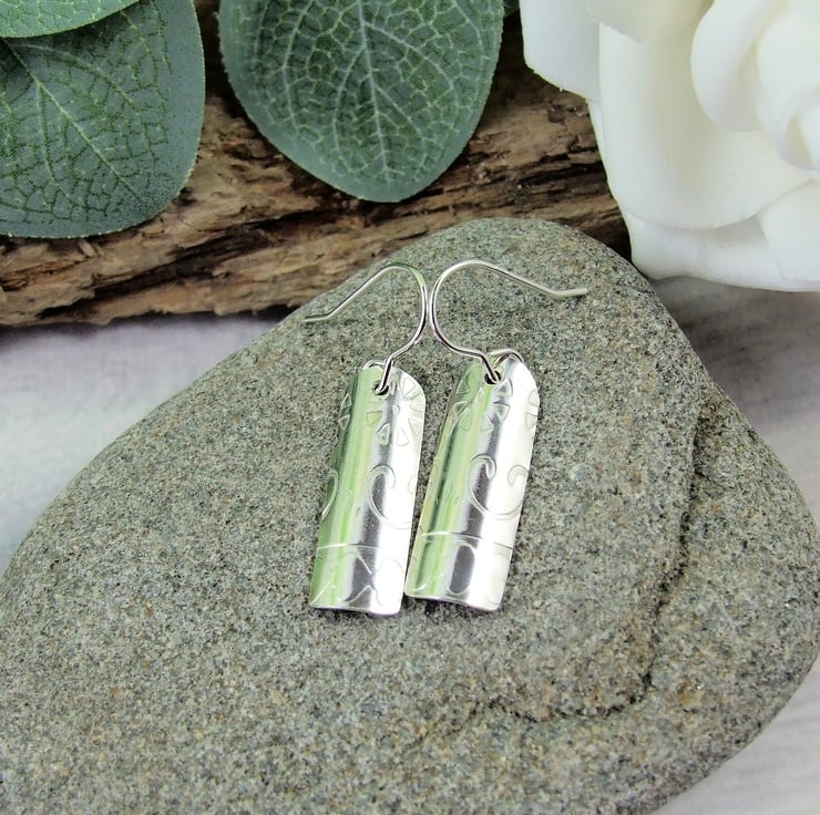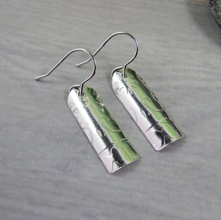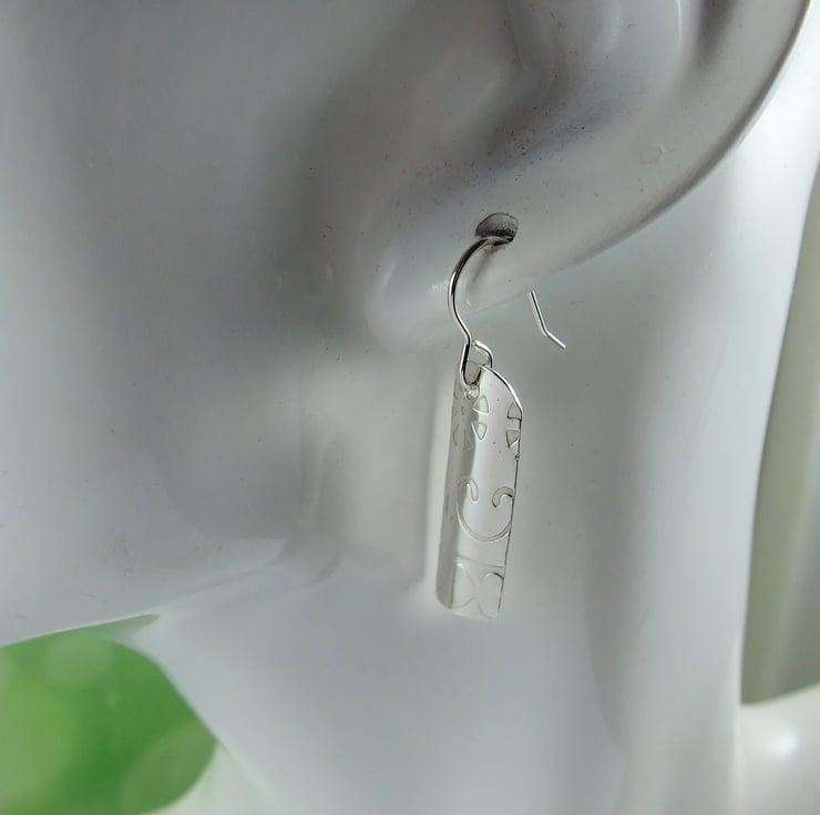 I have created the droppers from sterling silver sheet, cut into strips and textured with a geometric pattern, slightly domed to give some dimention. Fitted to Sterling silver ear hooks.