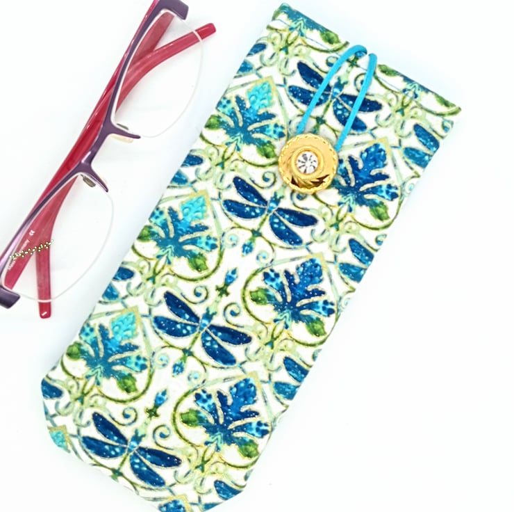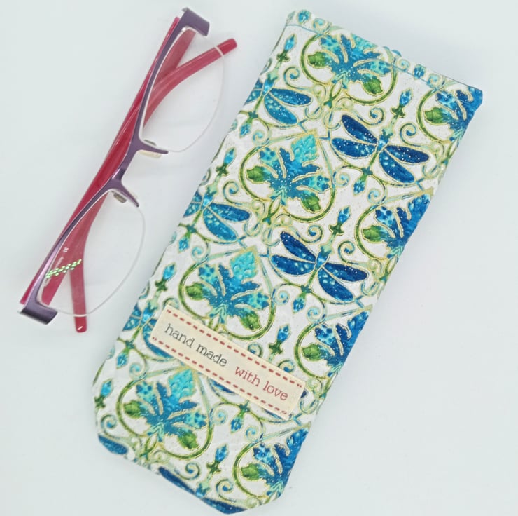 It is wadded to protect your glasses and features a hand made with love label on the reverse. The lining is in blue green batik cotton.