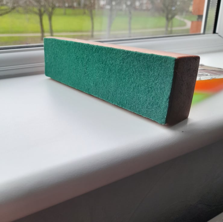 Base made from up-cycled mahogany which has been stained and has a green felt base.