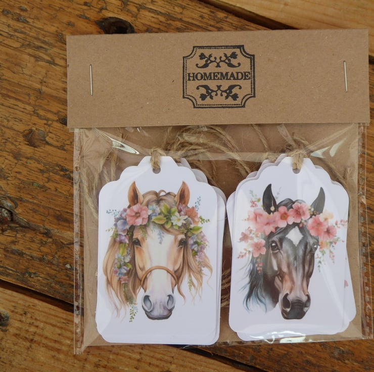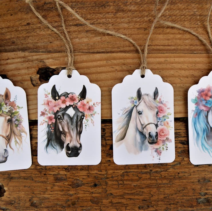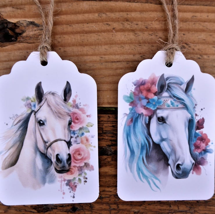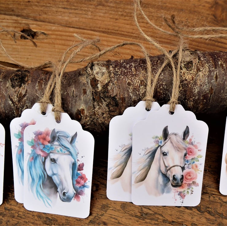Pack of 8 Gift Tags. There are 4 designs, 2 of each - images are horses and flowers. There is a string attached to each tag.