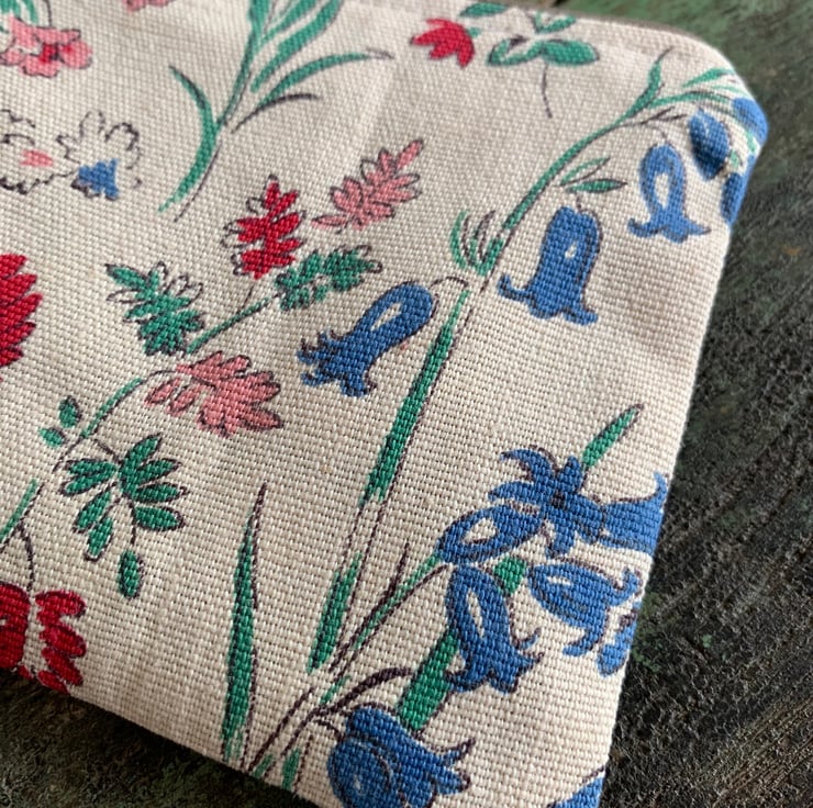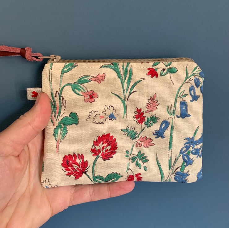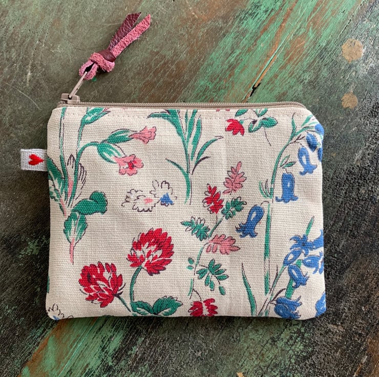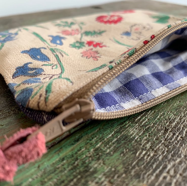 Pretty little coin purse made from vintage floral linen and lightweight denim from a sample swatch. It is lined with blue cotton gingham.