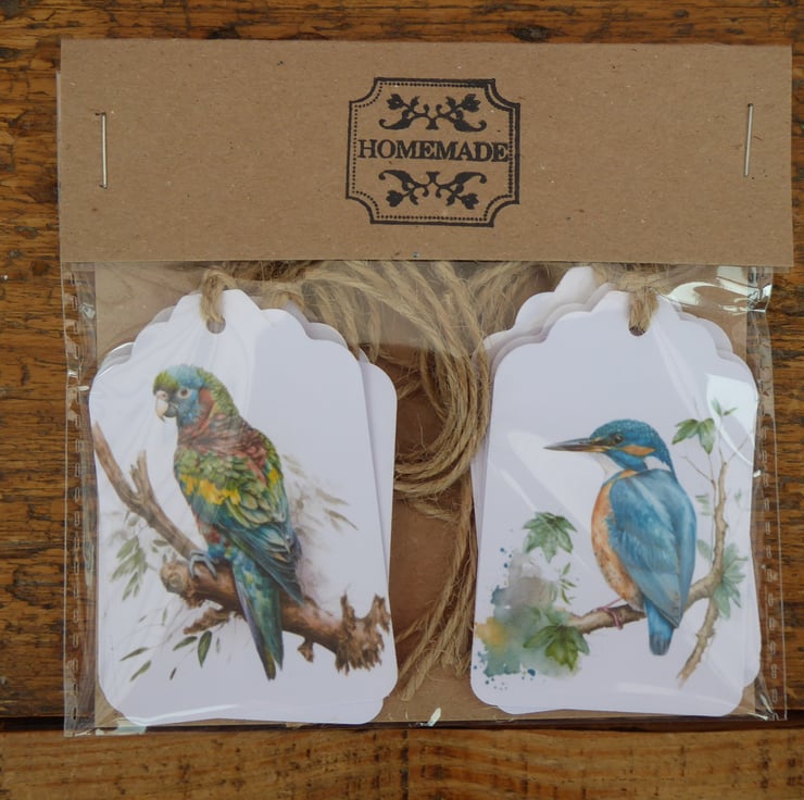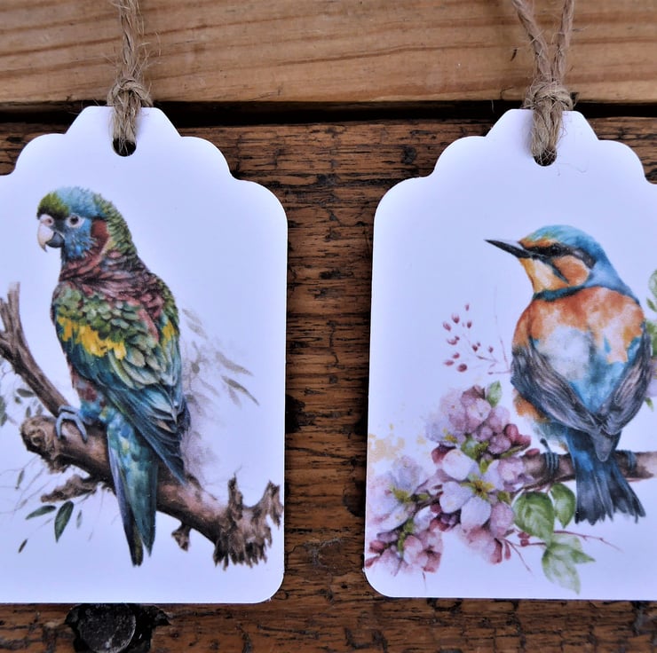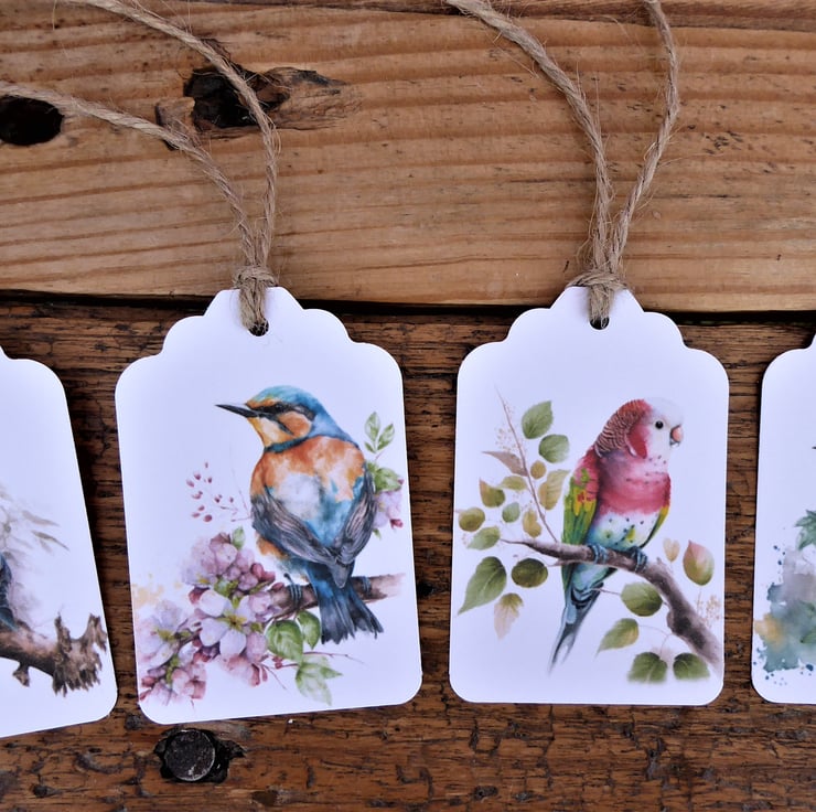 Pack of 8 Gift Tags - 4 designs, 2 of each - images are of birds. There is a string attached to each tag.