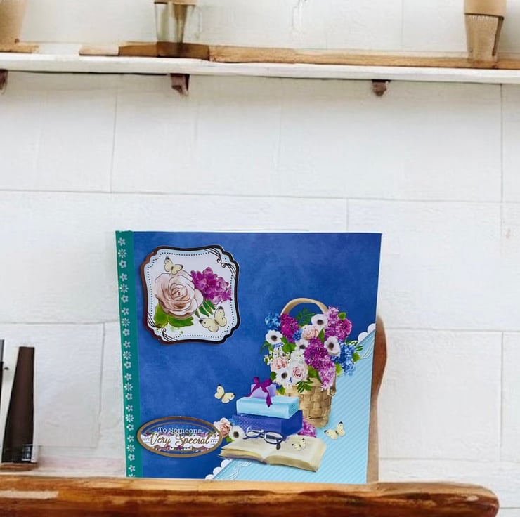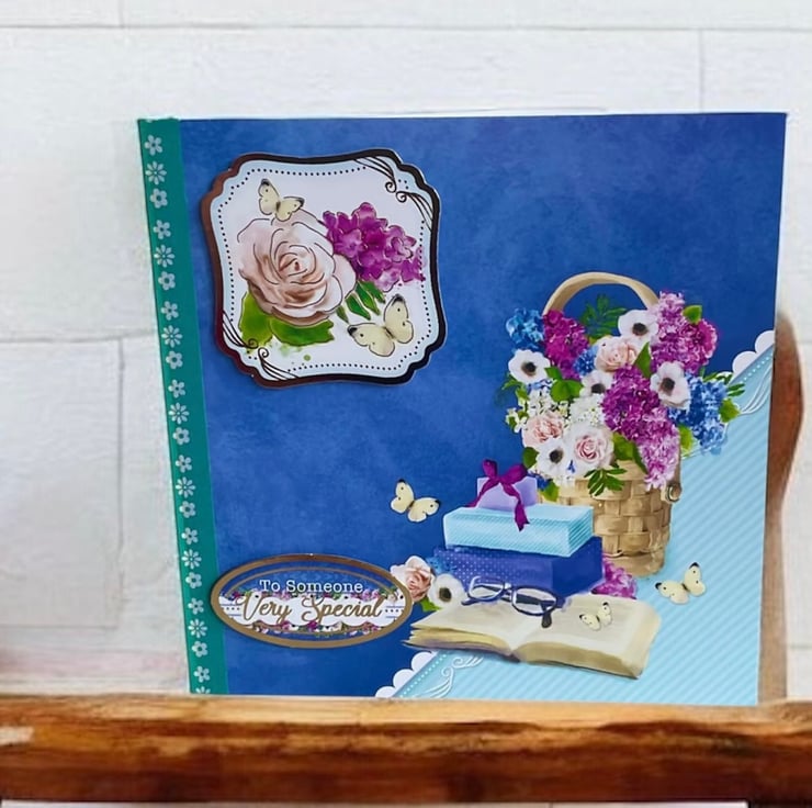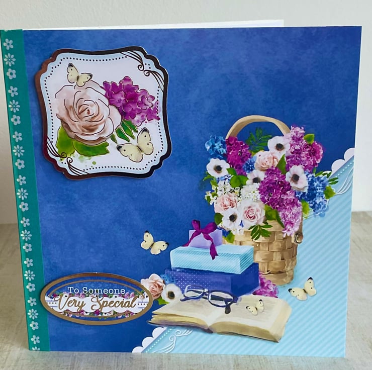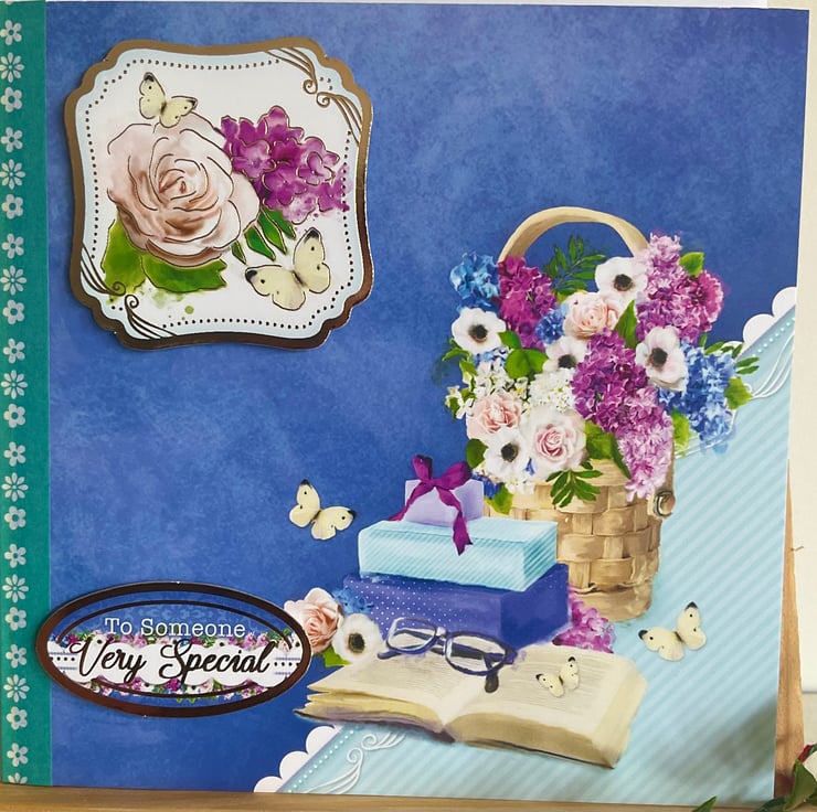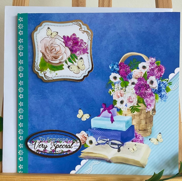 The ivory base card has been layered with the dark blue and pale blue printed card which features blue and dark purple hydrangeas, peonies, pink roses and white and purple spray flowers in a wicker basket. A book with glasses and presents also feature.