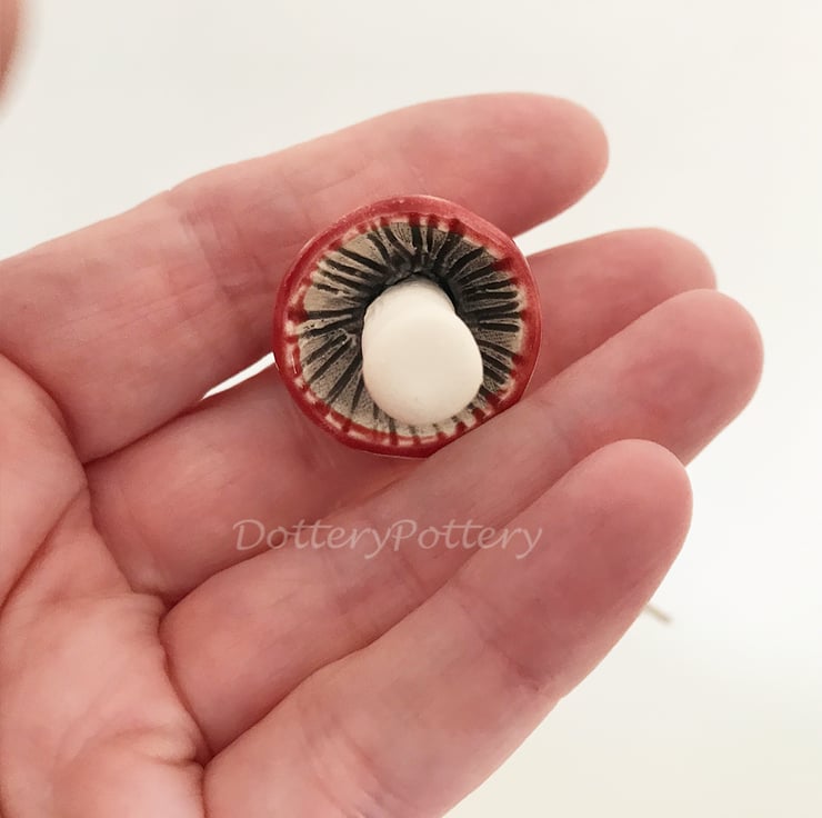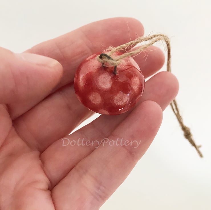 This toadstool decoration is made from white earthenware clay to represent the classic fairytale toadstool: fly agaric! I have etched and carved the gills of the body and highlighted them with a black glaze. The stem is left the natural colour of the clay itself and the distinctive red cap has been finished with a red and white glaze. It measures approx 3cm tall x 2.5cm wide and hangs from rustic brown string