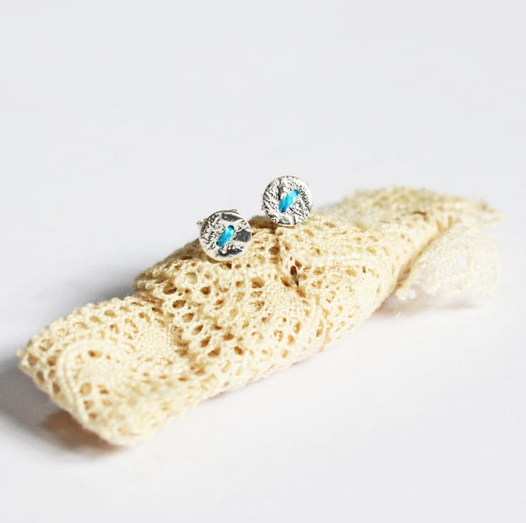 Textured with vintage lace (from my collections sourced over the years at French brocantes) using my rolling mill, I then hand-punch out circles with a disc cutter, before hand drilling holes. Filing and lots of emery follows before soldering sterling silver ear posts to the back.