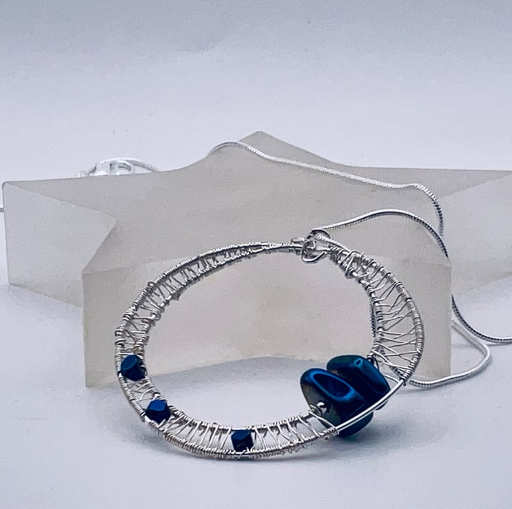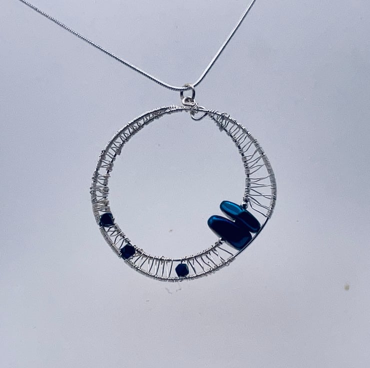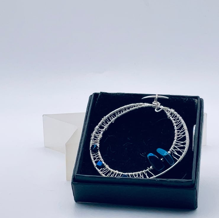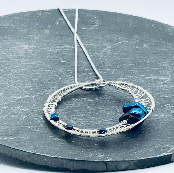 The twinkle of these midnight blue hematite slices and crystals is exquisite and will transform any ensemble for any long summer evening! Wire woven in a silver wheel in ladder stitch to impress all who behold! At some 40 mm in diameter and strung on a silver snake chain 650