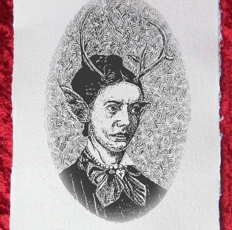 Born in Cardiff in the early 1970s, I spent my formative years surrounded by arcade machines, comics, TV and cinema; passions that mix happily with my love of tales of folklore, mythology and strange customs. I’m inspired by figurative art, magical surrealism, theatrical lighting, mysterious narratives, and old wives' tales. I incorporate pieces from my collection of antique and vintage vernacular photographs into the work, using traditional and digital techniques in its construction. The print is taken from a pencil drawing made in 2022.