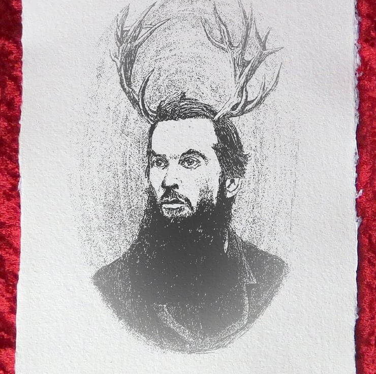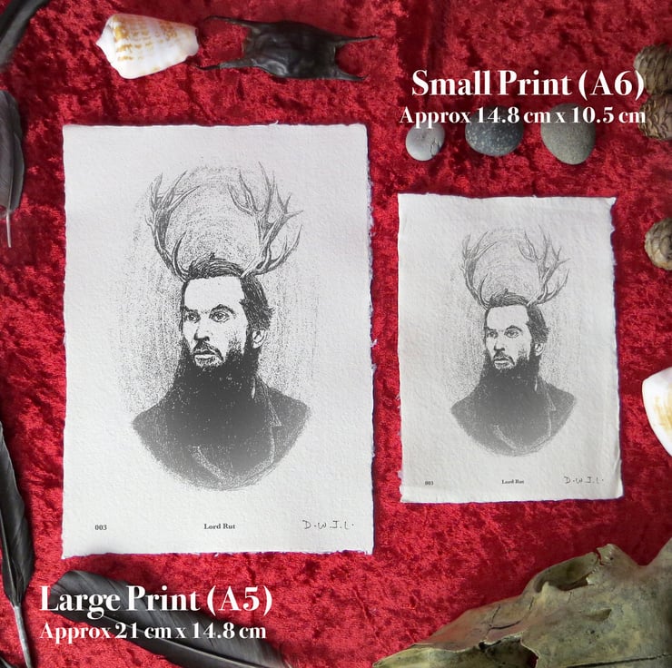 Introducing "Lord Rut" (2023), a hand-signed giclée print on handmade Khadi paper. The work is inspired by Celtic mythology and Welsh folklore. These prints, made and processed by the artist, are available in two sizes: small (148mm x 105mm) and large (210mm x 148mm).