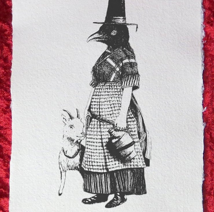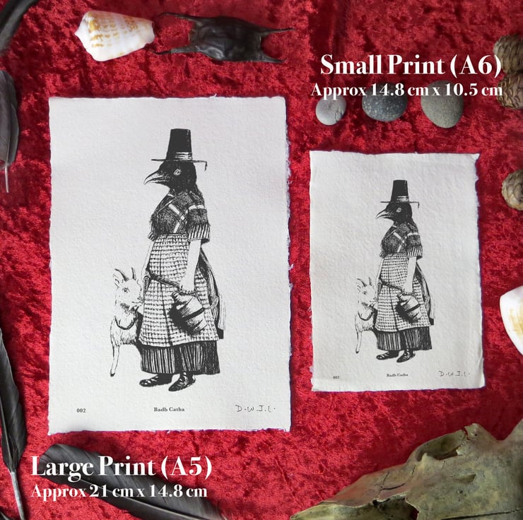Introducing "Badb Catha" (2023), a hand-signed giclée print on handmade Khadi paper. The work is inspired by Celtic mythology and Welsh folklore. These prints, made and processed by the artist, are available in two sizes: small (148mm x 105mm) and large (210mm x 148mm).