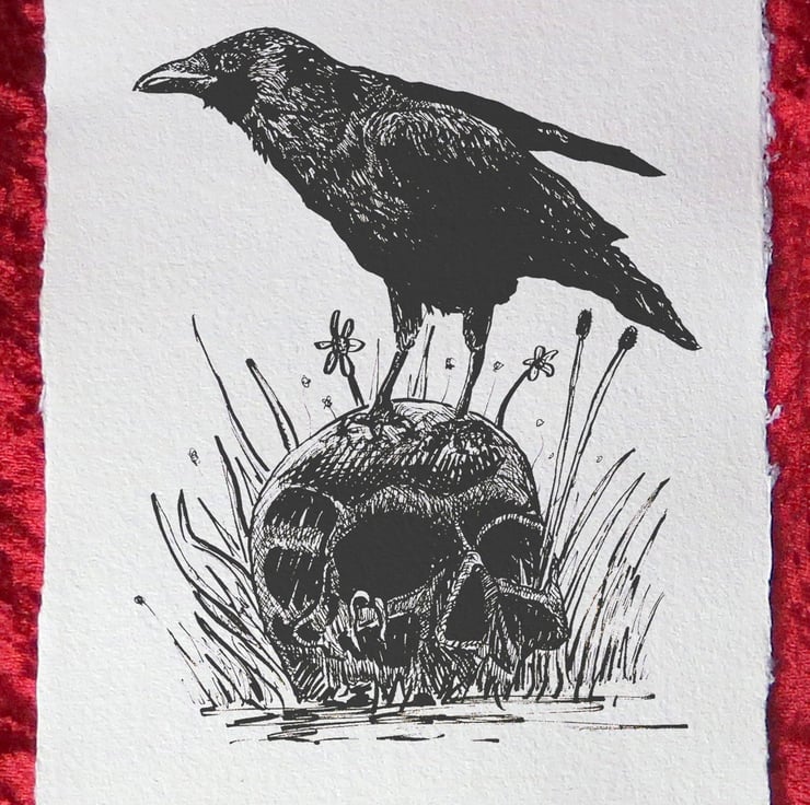 Introducing "Raven And Skull" (2023), a hand-signed giclée print on handmade Khadi paper. The work is inspired by Celtic mythology and Welsh folklore. These prints, made and processed by the artist, are available in two sizes: small (148mm x 105mm) and large (210mm x 148mm).
