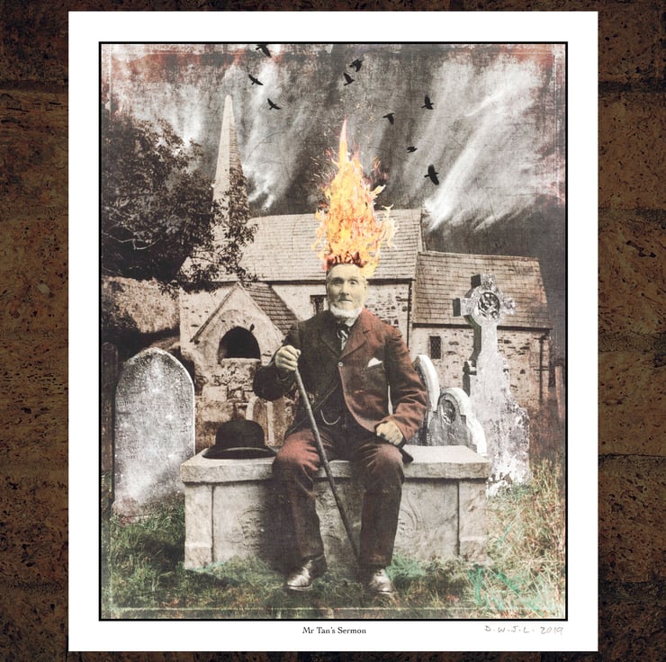 Introducing "Days Gone - Mr Tan's Sermon" (2019), a limited-edition, artist-made art print from the world of Day Trip Art. Inspired by Celtic mythology and Welsh folklore, these high-quality giclée prints are available in two sizes: small (254mm x 210mm) with a 12mm border, and large (A3 359mm x 297mm), titleless, with a 17mm border. Note that minor size variations may occur due to manual processing.