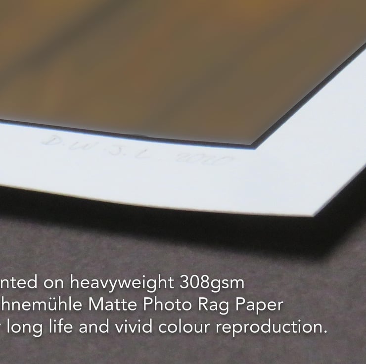 The small version has an edition of 200, and the large version an edition of 50, both signed and numbered. Each print is produced with meticulous care using a Canon Giclée printer, original Canon Lucia inks, and heavyweight 308gsm Hahnemuhle Photo Rag paper. They are made, packaged, and shipped by the artist. Items despatched within 3-4 days, but delivery times may vary according to location.