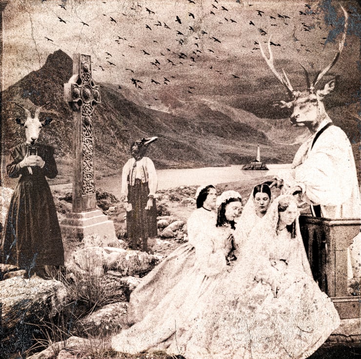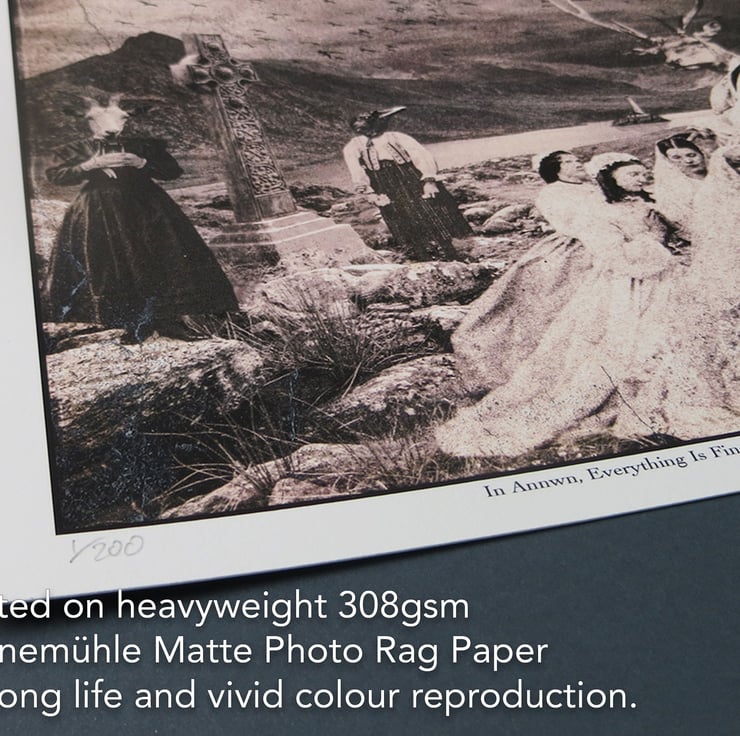 Born in Cardiff in the early 1970s, I spent my formative years surrounded by arcade machines, comics, TV and cinema; passions that mix happily with my love of tales of folklore, mythology and strange customs. I’m inspired by figurative art, magical surrealism, theatrical lighting, mysterious narratives, and old wives' tales. I incorporate pieces from my collection of antique and vintage vernacular photographs into the work, using traditional and digital techniques in its construction. This is one in the series of my series of images made about the magical land of Annwn. The original that the print is taken from was shown and sold at the 2019 Y Lle Celf.