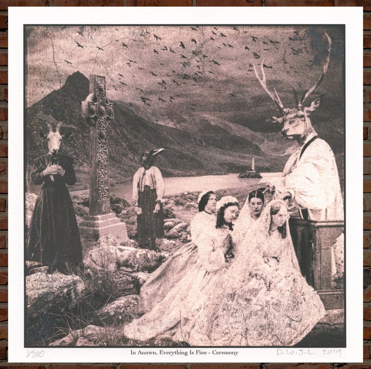 Introducing "In Annwn, Everything Is Fine - Ceremony" (2019), a limited-edition, artist-made art print from the world of Day Trip Art. Inspired by Celtic mythology and Welsh folklore, these high-quality giclée prints are available in two sizes: small (210mm x 210mm) with a 12mm border, and large (297mm x 297mm) with a 12mm border. Note that minor size variations may occur due to manual processing.