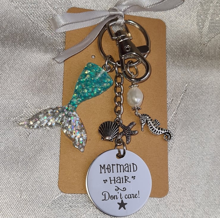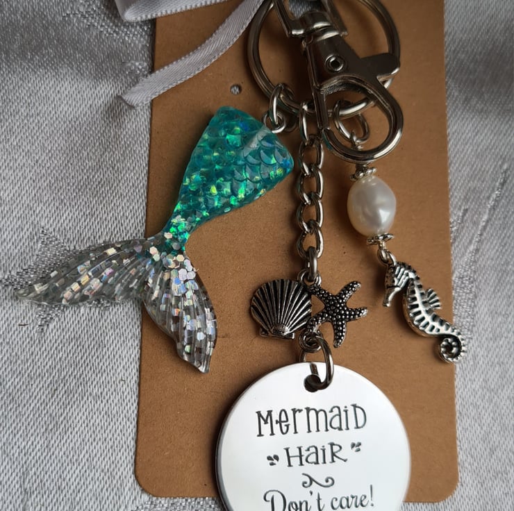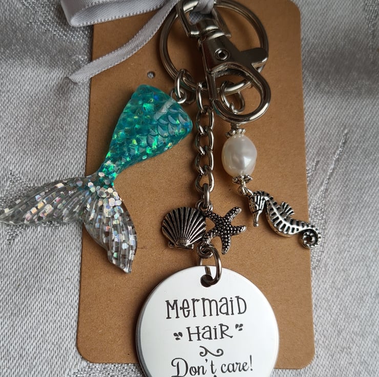 A beautiful bag charm/key ring for those who love mythical Mermaids. This gorgeous key ring consists of a laser engraved steel tag that has "Mermaid Hair Don't Care" on it, a Seahorse & Pearl charm and a Blue/Silvery mermaid tail charm. Great as a unique and unusual gift.