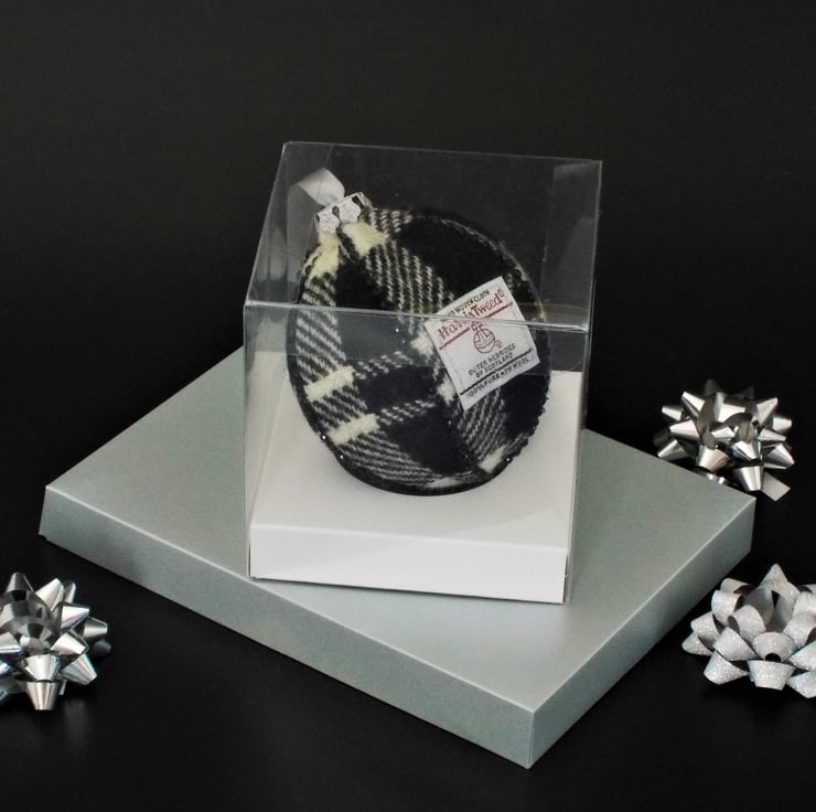 Monochrome Christmas tree decoration handmade from Harris tweed hand-woven fabric in black and white tartan. It is approx. 8.5cm (3.5 inches) in diameter and comes complete with a silver satin ribbon hanging loop. A small "Orb" label, your guarantee of genuine Harris tweed, is proudly displayed.