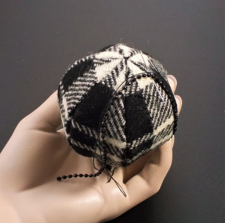 I have created this stunning monochrome bauble with six segments of fabric, alternating black and white herringbone with black and white tartan. Each shaped piece is hand-stitched together to make the 3D shape. Then I have decorated the segment seams with sparkling bead ribbon, also hand-stitched into place. The hanging ribbon and metal clasp top are finishing details.
