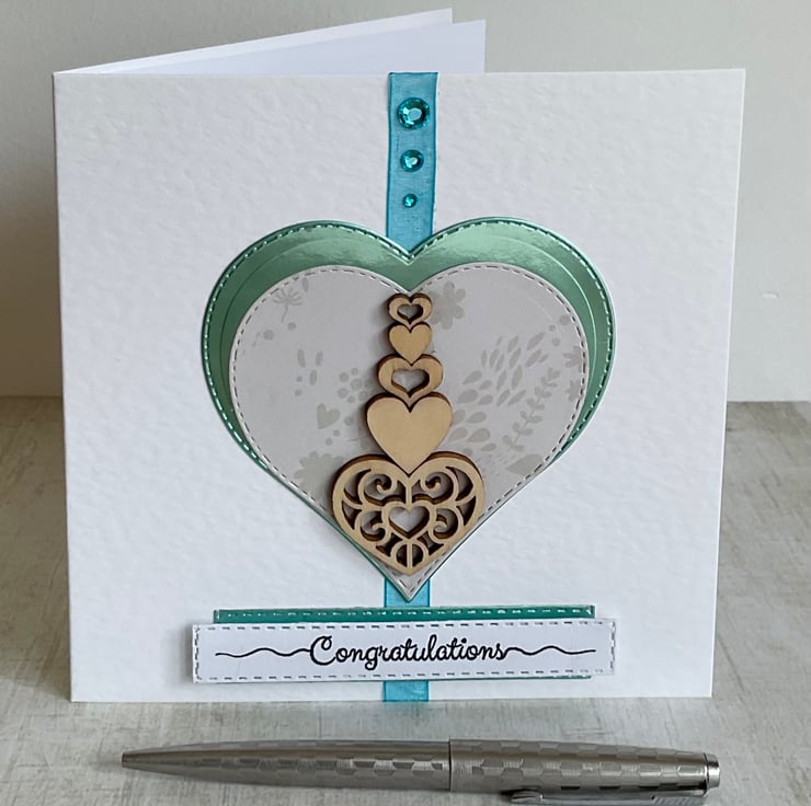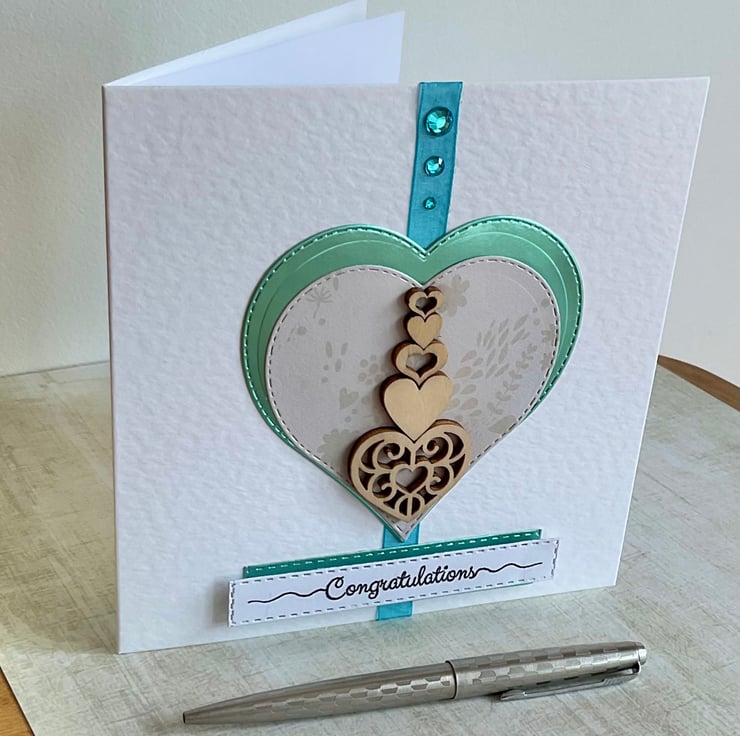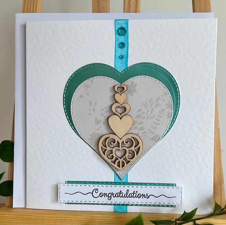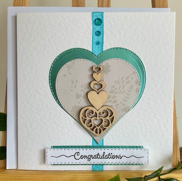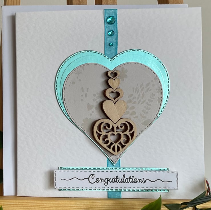 A die cut teal metallic card heart layered with a printed ivory heart has been applied to a hammered background. Wooden hearts run down the centre of the design.