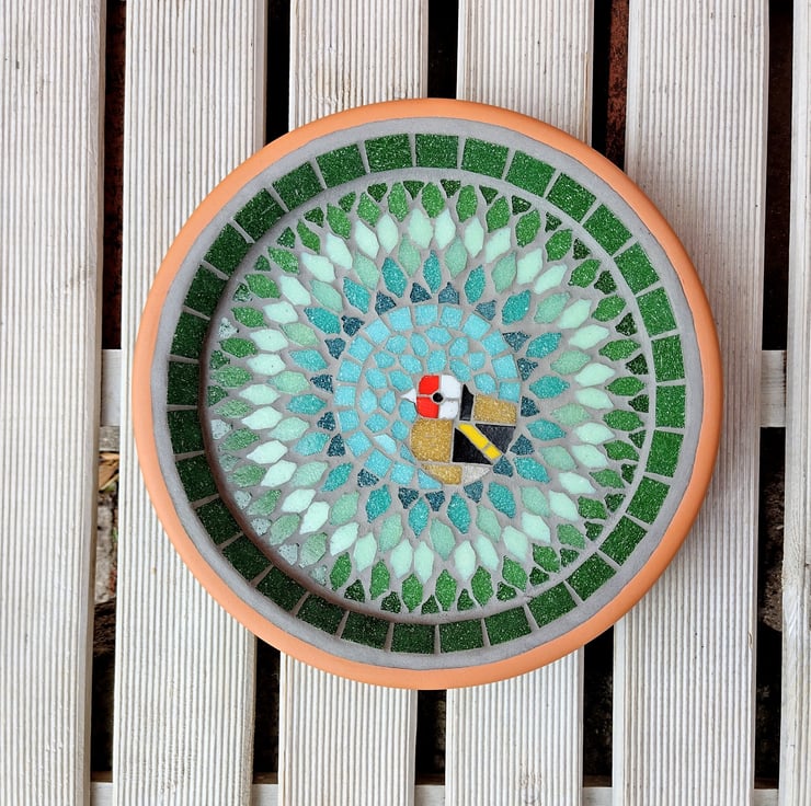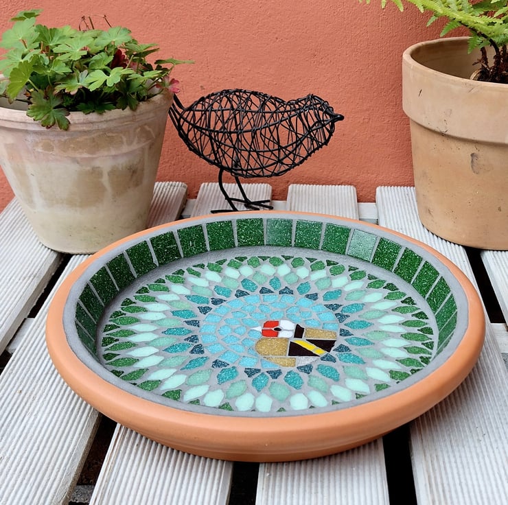 A 25cm (9.75 inch) diameter terracotta saucer with a mosaic made with glass tiles and a grey grout designed to repel algae and mould.