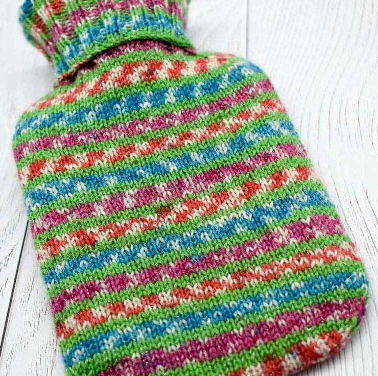 Hand knitted in 75% wool, 23% nylon and 2% polyester yarn, this cosy cover is has a striped design that also has sparkly thread running through the design.