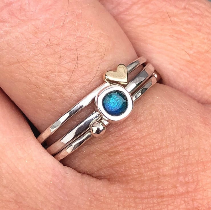Enamel Stack Ring, rockpool ring, hammered silver stack ring, gold heart ring,