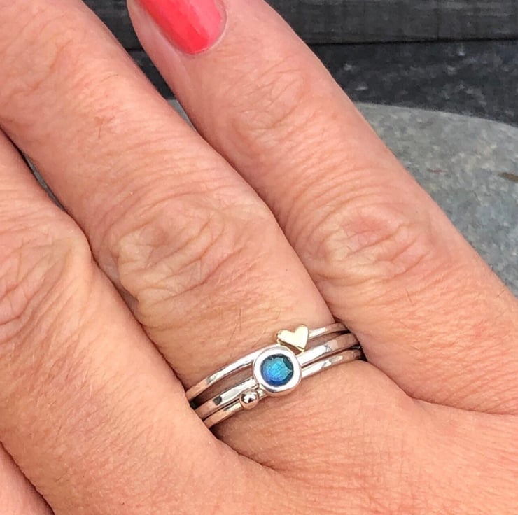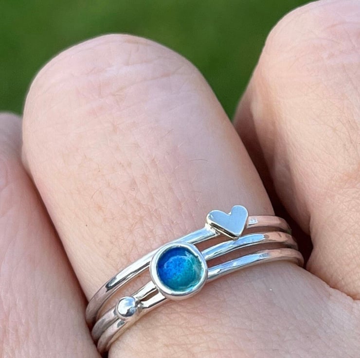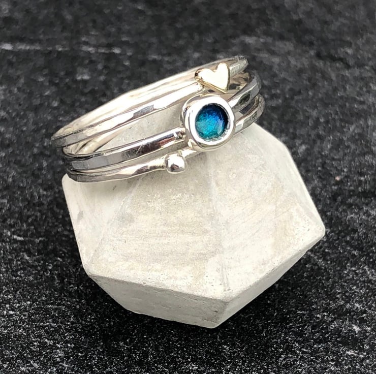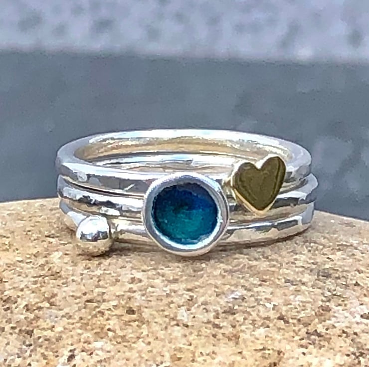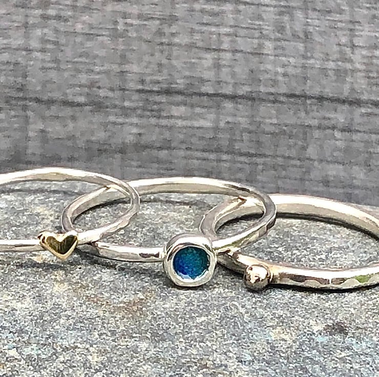 Enamel Stack Ring, rockpool ring, hammered silver stack ring, gold heart ring,