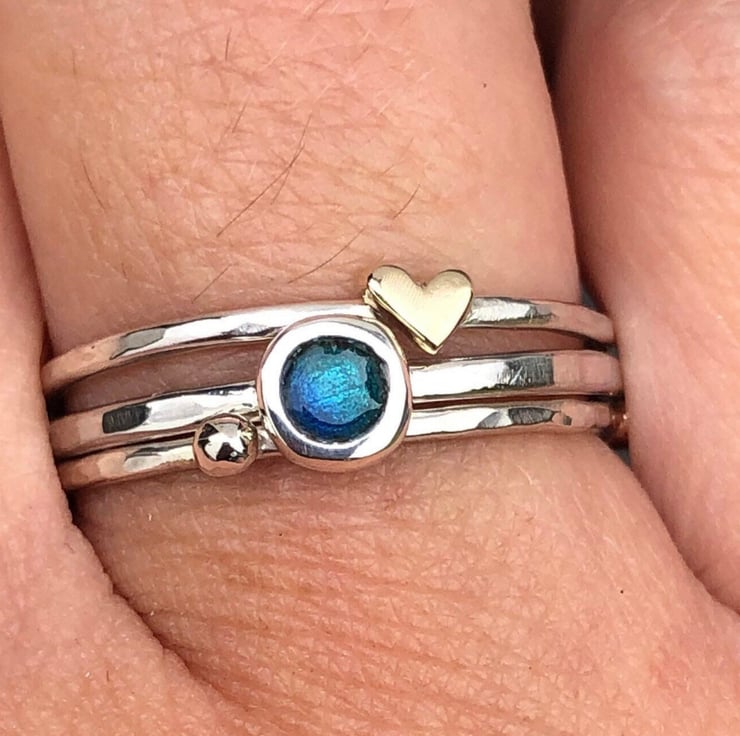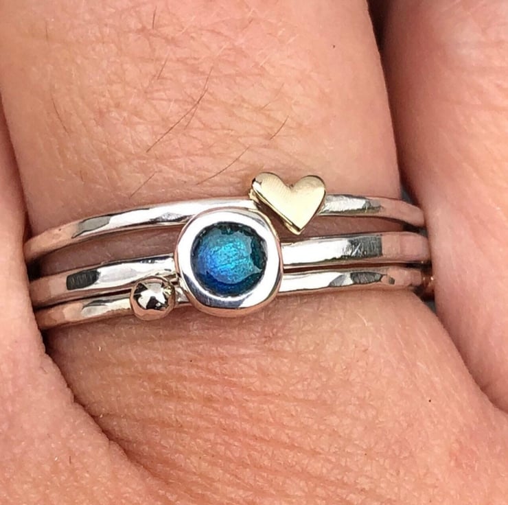 This silver stack ring is made from Sterling silver and is made up of three hammered rings. The first is a hammer textured enamel rock pool ring, the second is a 9ct gold heart ring and the third is one of my ‘water drop rings’ which has silver ‘bubble’ detail.