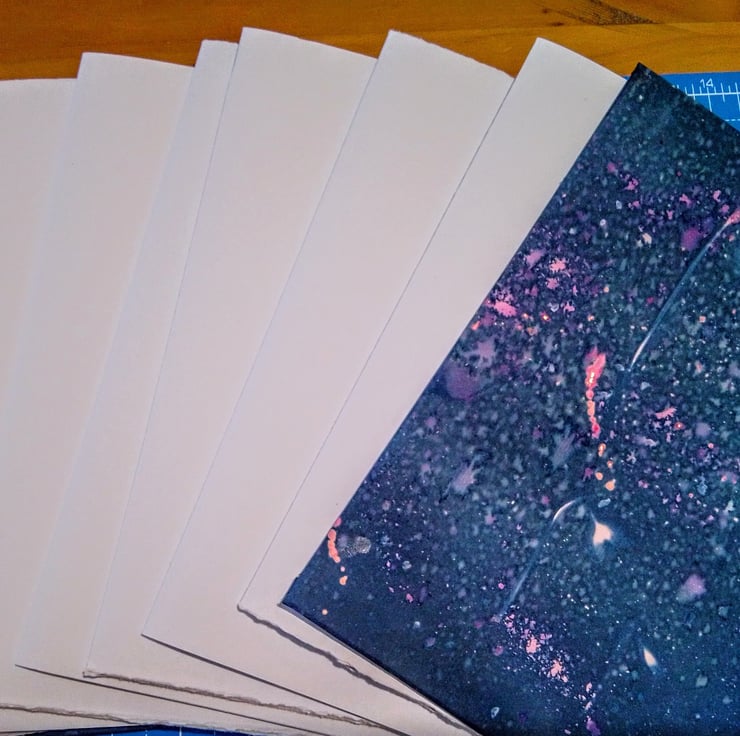 To create the cover prints, I used Fabriano Tiziano art paper in a lovely pale rose pink. It’s the perfect weight for creating the covers for my journals; strong enough to withstand the cyanotype chemicals and the dyes and inks I use in the development process; it can also stand up to the washing at the end of the process!