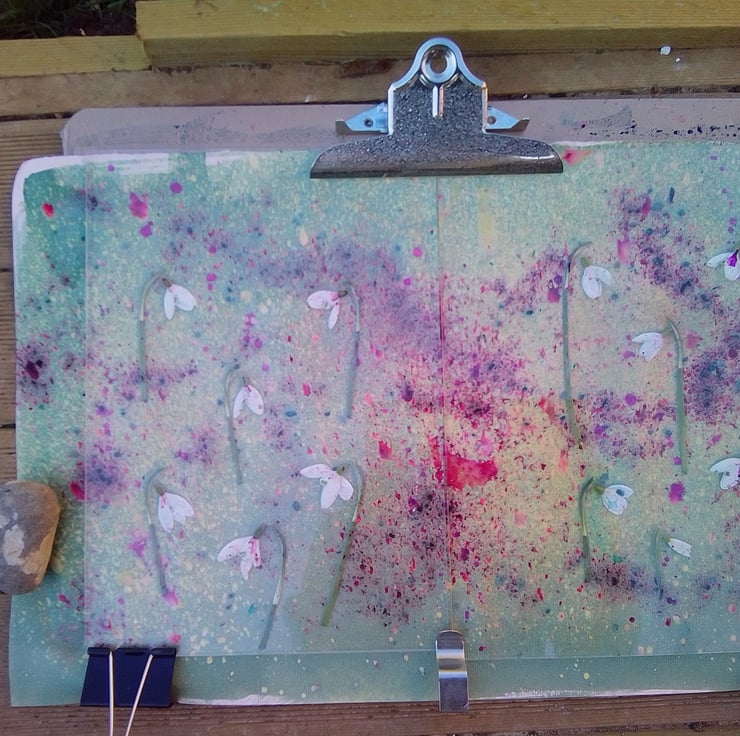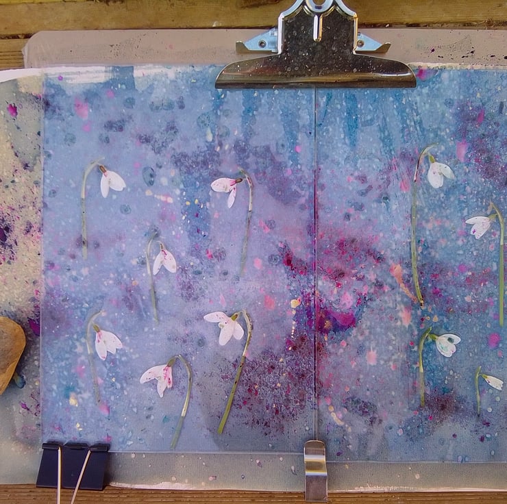 The covers for this pretty hand bound journal are original cyanotype prints, featuring snowdrops. I gathered these wildflowers from the hedgerows around my lovely Wiltshire home.