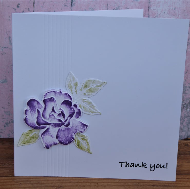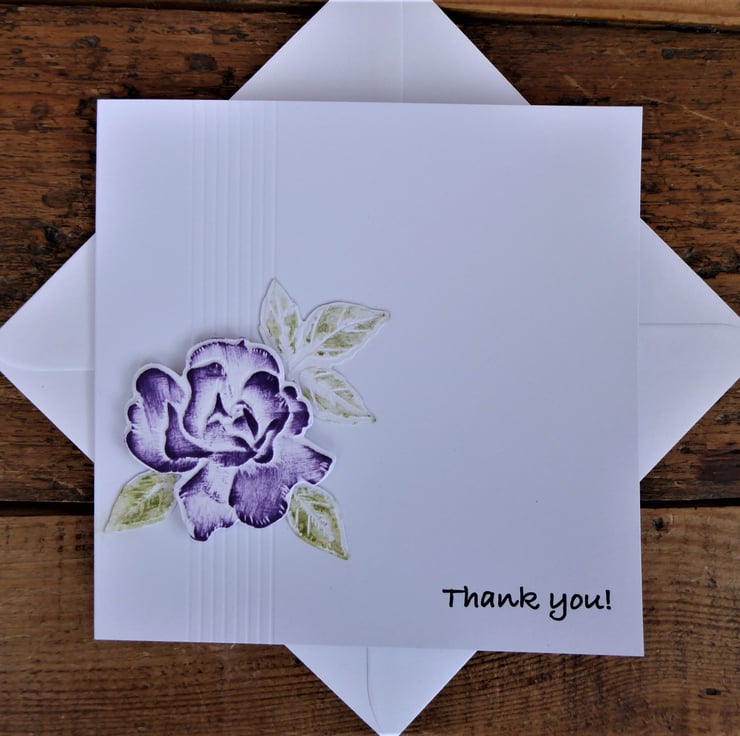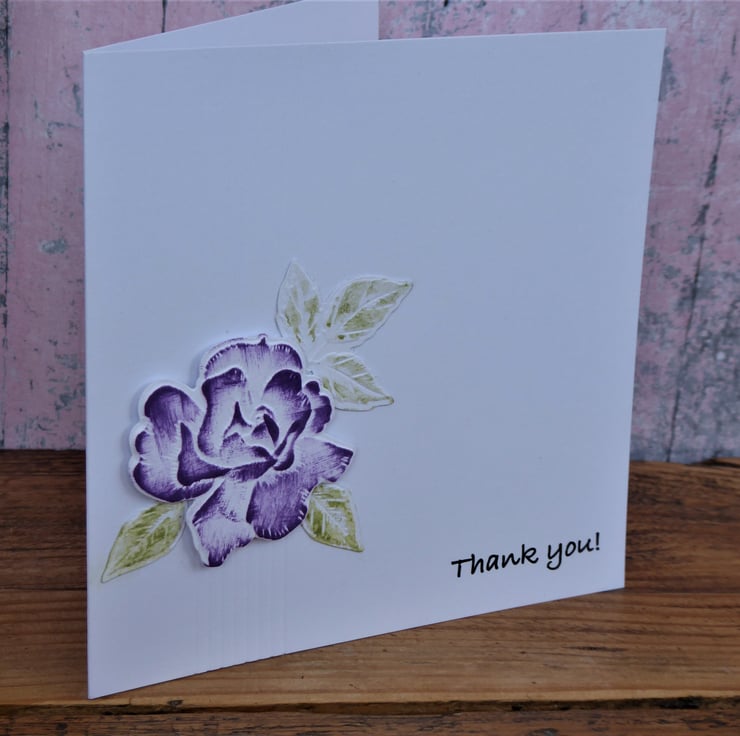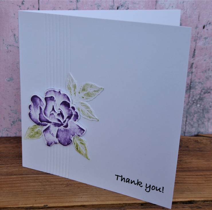 Thank you card made from 300gsm white card. Die-cut and embossed flower then added colour. Stamped out a sentiment to complete.